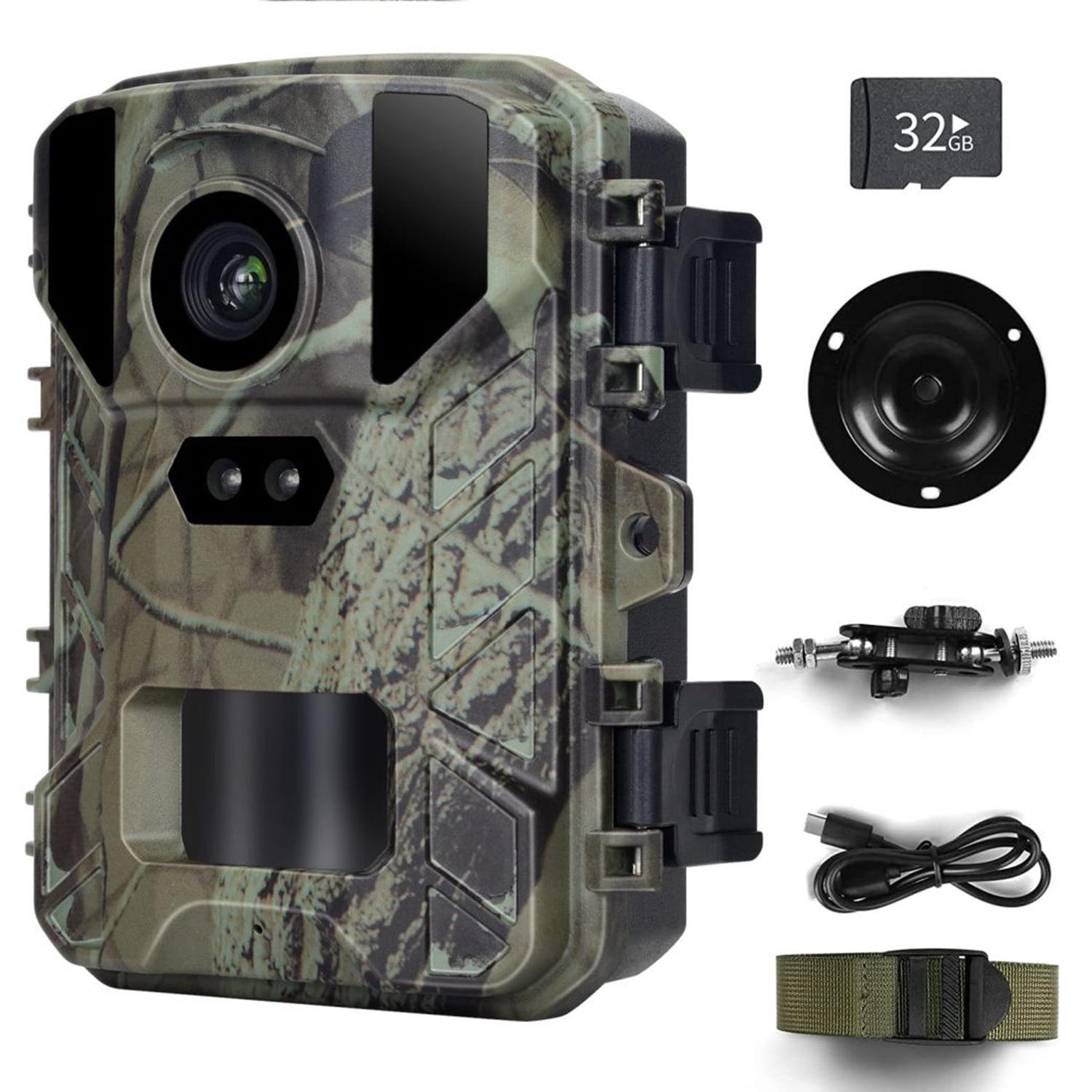 20MP/1080P photo/video resolution Comes with 32GB Micro SD card(MAX 32GB) no screen 4X AA Batteries (Not Included) Use the included USB cable or card reader to access files