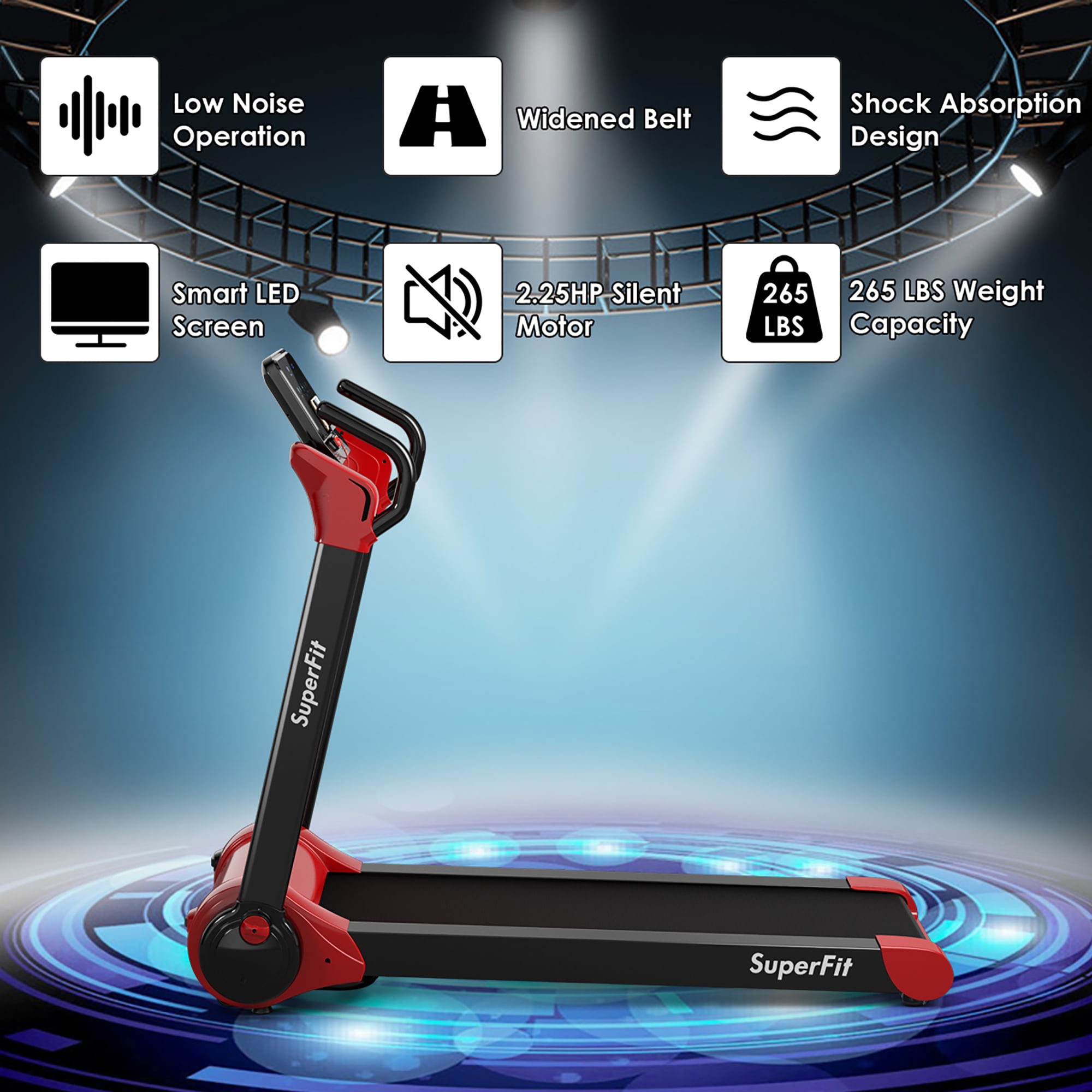 Our portable treadmill is a perfect choice for family and office workout. The powerful 2.25 HP motor provides you with comfortable exercise experience, which is very suitable for home and office use. And the speed can be adjusted from 1KM/H to 12 KM/H, allowing users to choose different exercising state. Bluetooth speakers and mobile phone holders allow you to enjoy music or favorite movies during your workout. When you finish exercising, the folding design and flexible wheels make it easy for you to store or move it from one room to another. In addition, comfortable hand grips and non-slip belt protect you from falling down. Moreover, with an easy one-touch operation, you can monitor real-time data for each exercise, including speed, time, calories, distance and step. Please do not place the treadmill on carpet during usage to avoid motor overheat Please do not place the treadmill on carpet during usage to avoid motor overheat Feature Powerful 2.25 HP quiet motor significantly enhance sports effect Speed unit could be switched between mile and km in APP Connect the treadmill to your phone through Bluetooth to enjoy music Fast set the speed to 5 KM/H or 8 KM/H 5-layer shock-absorbing running belt reduces impact during sports Built-in 4 flexible transport wheels make it easy to move and store Safety key is used for emergency braking and can avoid safety accidents Phone holder help you to enjoy movies while running Integrated installation-free design makes it easy to use 16.5” widened running belt allows you to run freely Rubber foot pads greatly reduce impact LED display screen helps to monitor speed, distance, time, step and calories in real-time Specification Color: Red Material: Metal Overall Dimension: 55.9″ x 30.5″ x 49.5″ (L x W x H) Folding Dimension: 11.8″ x 30.5″ x 55.9″ (L x W x H) Running Area: 43.5” x 16.5” Net Weight: 86lbs Speed: 1.0-12.8 km/h Control Method: Touch Button Weight Capacity: 265lbs Voltage: AC 110V 50/60Hz Power: 2.25HP Package includes: 1 x Treadmill 1 x Accessory Bag 1 x User Manual