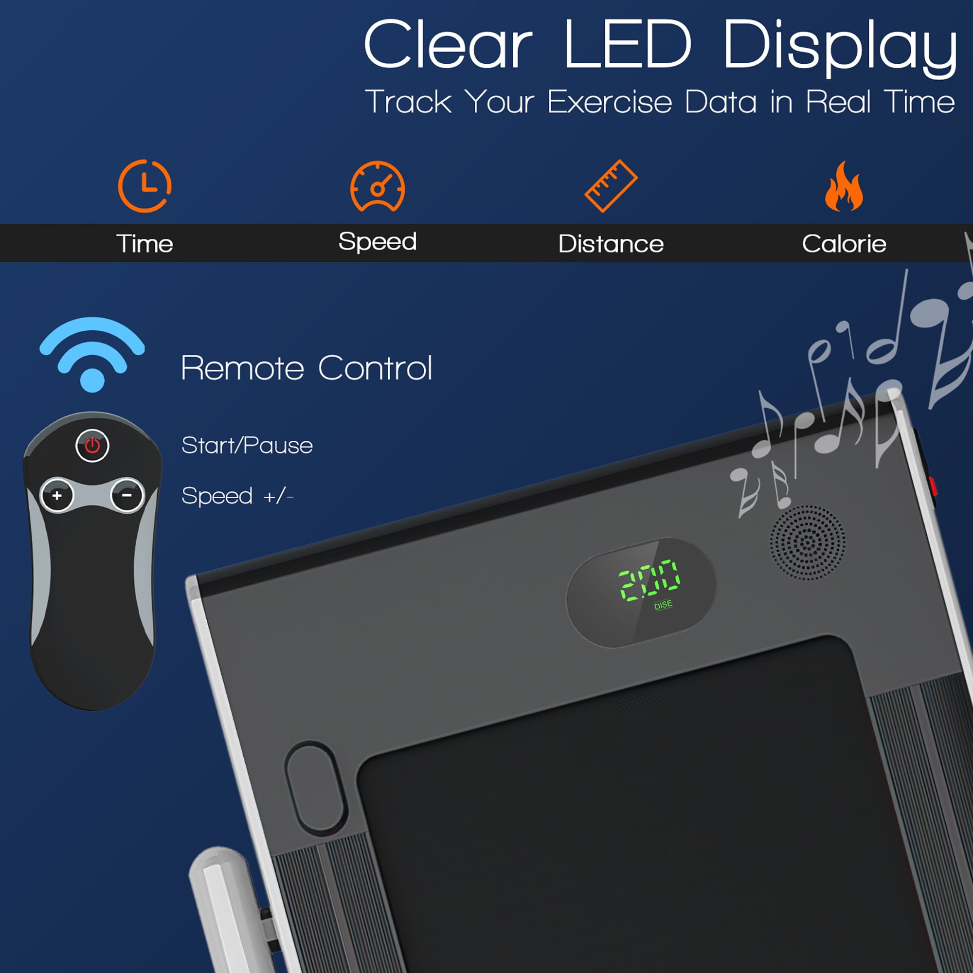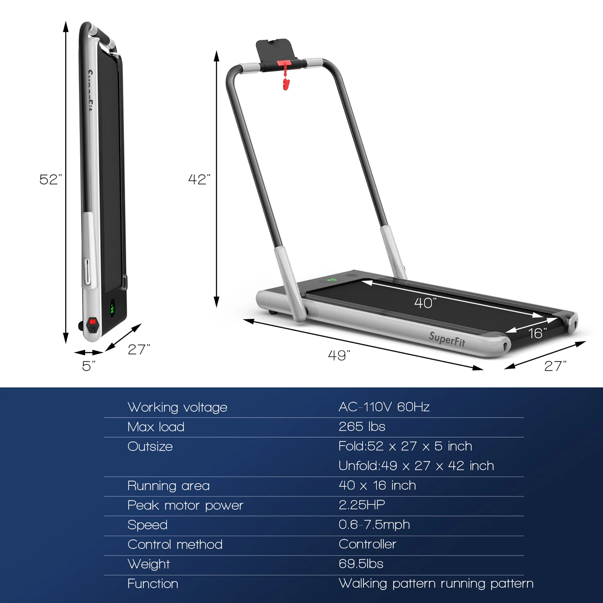 Do you want to have a healthy body and a perfect figure? Our innovative 2-in-1 folding treadmill has 2 sport modes that can be used as a running treadmill and a under desk walking treadmill. You can use it for walking, jogging and running, which is very suitable for home, office and gym. With a powerful 2.25 HP ultra-quiet motor, it provides you with a quiet and comfortable sports environment without disturbing others. 5-layer non-slip and shock-absorbing running belt provides effective cushioning for your back, joints, muscles, knees and ankles. A versatile LED display monitors your movement data in real time. You can connect the treadmill to your phone through Bluetooth and play music while you are exercising. In addition, it equipped with a remote control and APP control for better training. The compact design and transport wheels make this treadmill easy to fold, move and store. Start exercising now and burn your calories! Feature The 2-in-1 treadmill can be used as a under desk treadmill and a running treadmill Speed unit could be switched between mile and km in APP The speed of running belt is 1-4km/h in the walking mode and 1-12km/h in the running mode The powerful 2.25HP quiet motor makes your running quieter and more comfortable Multi-layer shield design and sturdy steel frame make it shock-absorbing and noise-reducing 5-layer non-slip running belt provides an effective and safe cushion for your knees and muscles LED display clearly shows time, speed, distance and calories, monitoring your movement data in real time You can conveniently use the remote control to adjust your movement speed and stop instantly High-performance speaker delivers a clear stereo experience by playing music through Bluetooth Use the phone holder to watch videos or chat with friends while running Please do not place the treadmill on carpet during usage to avoid motor overheat Specification Material: ABS Color: Silver Overall Dimension: 49”x 27”x 42” Folding Dimension: 52”x 27”x 5” Running Area Size: 40″ x16″ Net Weight: 74 lbs Weigh Capacity: 265 lbs Working Voltage: AC 110V 60Hz Peak Motor Power: 2.25HP Speed: 1.0-12.0 km/h Control Method: Controller Screen Display: Time, Speed, Distance, Calorie Package Included: 1x 2 in 1 Folding Treadmill 1x Remote Control(Need 1xCR2032 button battery,not included) 1x Phone Holder 1x Safety Key 1x Power Cord 1x Instruction