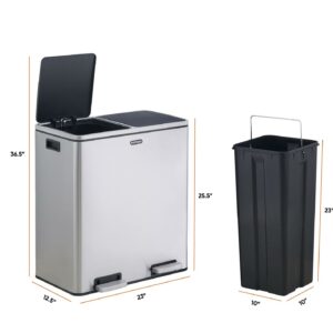 – Dual Bin Design: Enjoy the convenience and versatility of two separate bins in one large trash can. Each outer can is decorated in gorgeous stainless steel and has a separate pedal for each bin’s lid. That means you can keep garbage in one bin and recycling in another without cross-contamination.