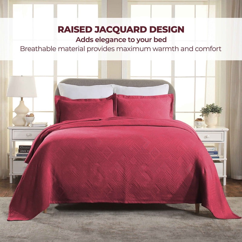 Superior Cotton Matelassé Jacquard Geometric Bedspread Set : Set Includes: One bedspread, and two pillow shams (Twin/ Twin XL size includes one pillow sham) Material: 100% Cotton Style: It appeals to everyone with its modern, elegant, contemporary and country styles. Unique Quality: It has high durability with extra strong binding at the corners to prevent fraying. Intricate matelassé design displays a lovely paisley pattern to lend a charming accent to any master bedroom, guest room, or teen bedroom Various Colors: This product, which has 10 different color options suitable for all tastes such as burgundy, bisque, charcoal, cappuccino, ivory, peacock blue, platinum, salmon, sweet pea, white, will easily adapt to any place used. This luxurious bedspread set is machine washable; wash on a gentle cycle and tumble dry low; do not iron and use non-chlorine bleach if necessary; always follow care label instructions for best results We’re committed to make products safer for you and safer for the world; STANDARD 100 by OEKO-TEX certified; Every component of this product has been tested and verified free of harmful substances and produced sustainably Dimensions: Twin: Bedspread is 81″ wide x 110″ long, Pillow Sham is 20″ Wide x 26″ Long Full: Bedspread is 96″ wide x 110″ long, Pillow Sham is 20″ Wide x 26″ Long Each Queen: Bedspread is 102″ wide x 120″ long, Pillow Sham is 20″ Wide x 26″ Long Each King: Bedspread is 120″ wide x 120″ long, Pillow Sham is 20″ Wide x 36″ Long Each