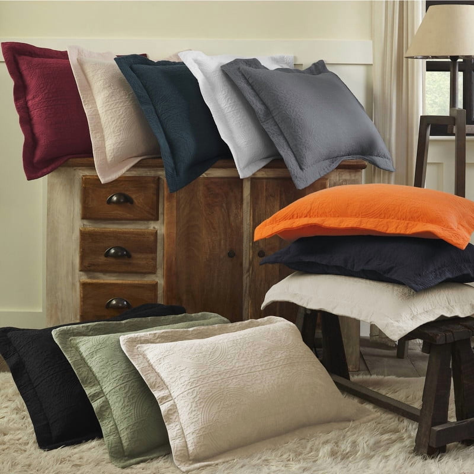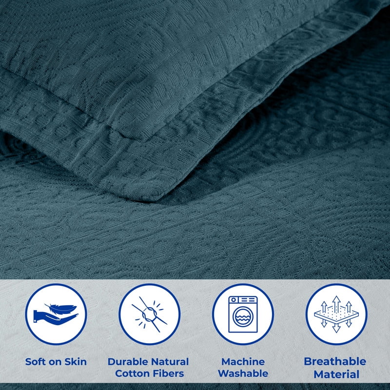 Superior Jacquard Matelassé Cotton Bedspread Set of 3 Pieces : Set Includes: One (1) Bedspread, Two (2) Pillow Shams Material: 100% Cotton Pattern: Fleur-de-Lis, Floral Weight: 330 GSM Quality: Jacquard Matelassé, Textured Style: Modern & Contemporary Available in elegant Black, Deep Sea, Garnet, Grey, Ivory, Linen, Mandarin, Navy Blue, Sage, Silver, White, and Peach color options and an assortment of sizes; generously sized bedspread hangs all the way to the floor This luxurious bedspread set is machine washable; wash on a gentle cycle and tumble dry low; do not iron and use non-chlorine bleach if necessary; always follow care label instructions for best results We’re committed to make products safer for you and safer for the world; STANDARD 100 by OEKO-TEX certified; Every component of this product has been tested and verified free of harmful substances and produced sustainably Dimensions: Twin Bedspread is 81″” wide x 110″” long, Pillow Sham is 20″” Wide x 26″” Long Full Bedspread is 96″” wide x 110″” long, Pillow Sham is 20″” Wide x 26″” Long Each Queen Bedspread is 102″” wide x 120″” long, Pillow Sham is 20″” Wide x 26″” Long Each King Bedspread is 120″” wide x 120″” long, Pillow Sham is 20″” Wide x 36″” Long Each