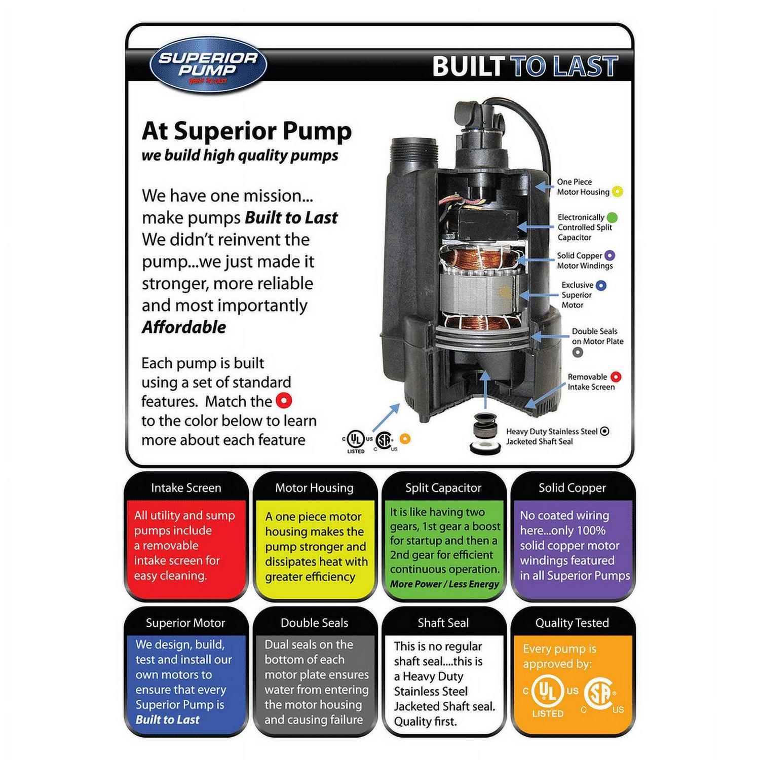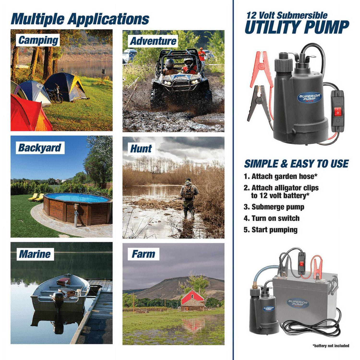 Superior Pump builds utility pumps that are truly built to last and are 100 percent factory tested. Superior Pump uses quality components including solid copper motor windings, heavy duty stainless steel jacketed shaft seals, double o-ring seals on motor plate, and electronically controlled split capacitors. Superior Pump model 91012, 12 Volt submersible utility pump, will move water up to 1380 gallons per hour. Pump water virtually anywhere using a 12 Volt battery. This versatile pump can be used for camping, hunting, fishing, as a backup boat bilge pump, cabins, basements, or other general water transfer applications. This water pump is backed by a 1 year warranty battery not included. Battery not included.
