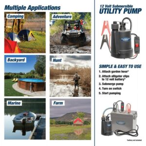 – 12 volt fully submersible utility pump for use with most 12 Volt battery (battery not included)