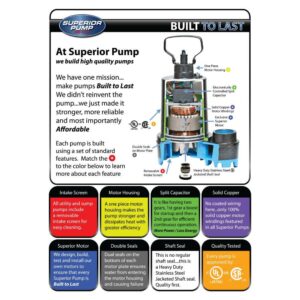 Superior Pump builds utility pumps that are truly built to last and are 100% factory tested. Superior Pump uses quality components including solid copper motor windings, heavy duty stainless steel jacketed shaft seals, double o-ring seals on motor plate, and electronically controlled split capacitors. Superior Pump model 92341, 1/3 HP submersible sump pump with vertical float switch and stainless steel impeller, will move water up to 2760 gallons per hour. This water pump is UL/cu listed and CSA certified and backed by a 3 year warranty.