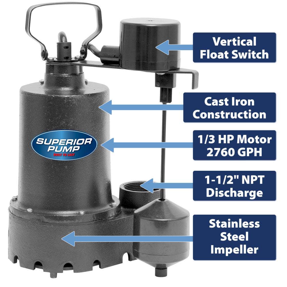 Superior Pump 92341 Cast Iron Utility Water Sump Pump With Vertical Float Switch, 1/3 HP:
