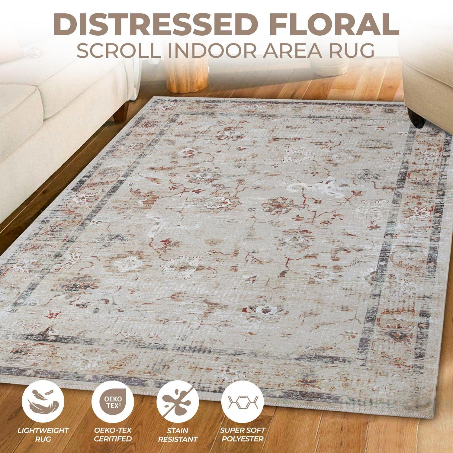 Effortlessly decorate with the Superior Swan Distressed Traditional Washable Indoor Area Rug or Runner. This rug displays a gorgeous floral scroll design made of Polyester fibers that have been expertly woven onto a non-slip felt dot backing. With a 1 mm pile construction, this rug lays easily under most doors and is durable enough to withstand high foot traffic, making it an ideal option to decorate living rooms, entryways, and dining rooms. This rug is the perfect piece to establish fashion and durability in Traditional, Vintage, or Rustic styled homes, as well as an exquisite option for homes with children and pets. This rug is available in an assortment of sizes to bring charm to any space in your home.