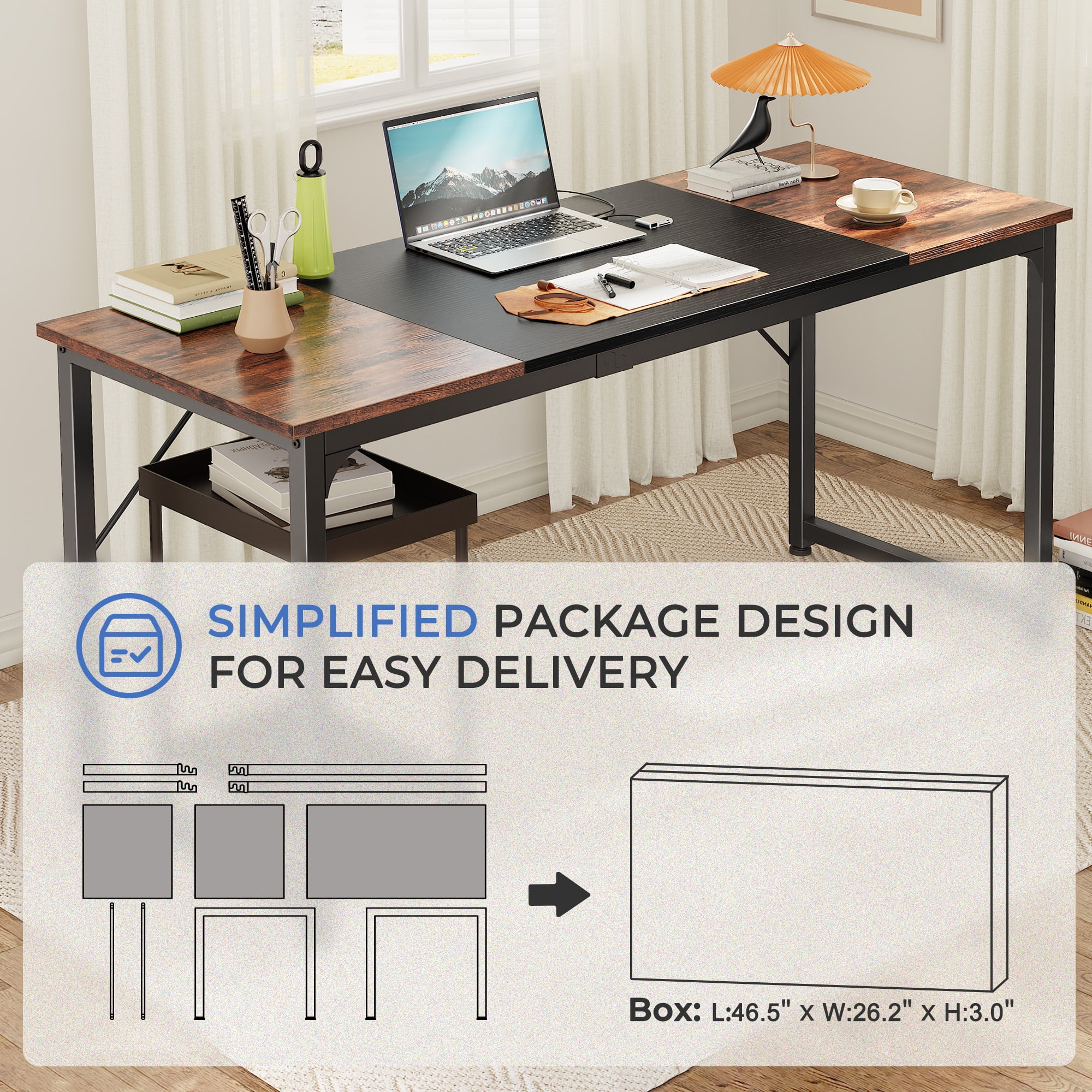 Modern Writing Desk with Storage: Enjoy large and spacious desktop, our wide computer desk is perfect for your home office, kid’s room, or apartment. Many Use Occasions: Available in multiple colors, our desk isn’t just for work – it’s perfect for writing, studying, or gaming, catering to various needs and preferences. Sturdy Frame: Powder-coated metal frame and durable particle board ensure long-term use. Effortless Assembly: With a compact, eco-friendly package, our desk is easy to deliver and transport. Plus, assembly is a breeze with simple instructions and provided tools, taking less than 30 minutes.