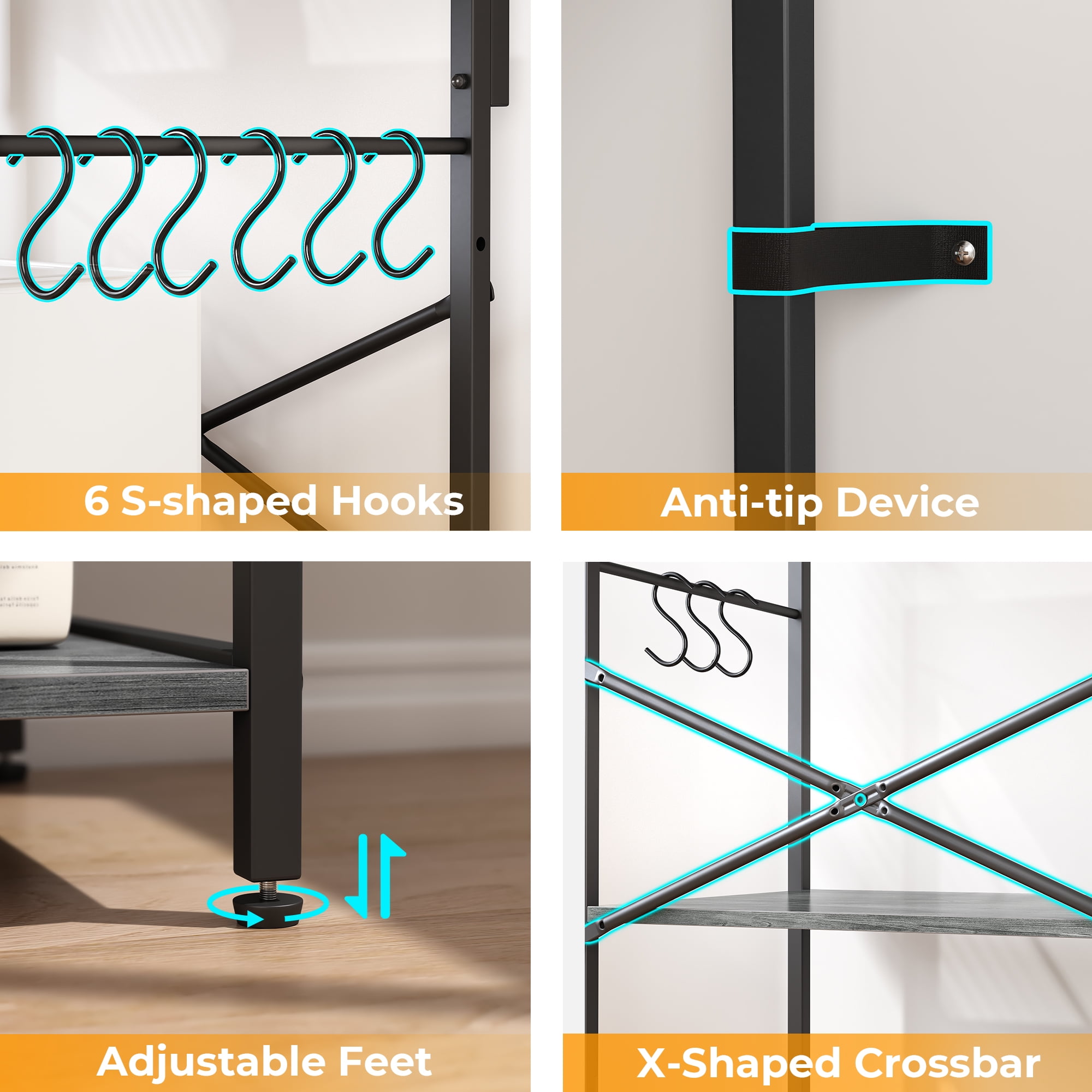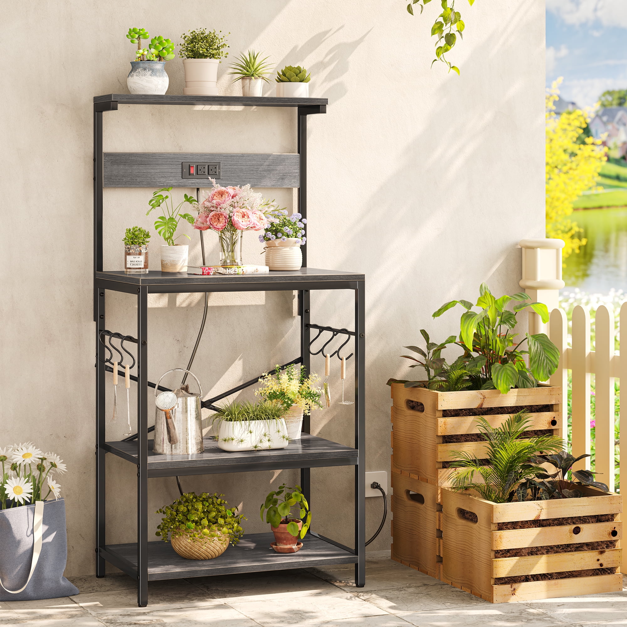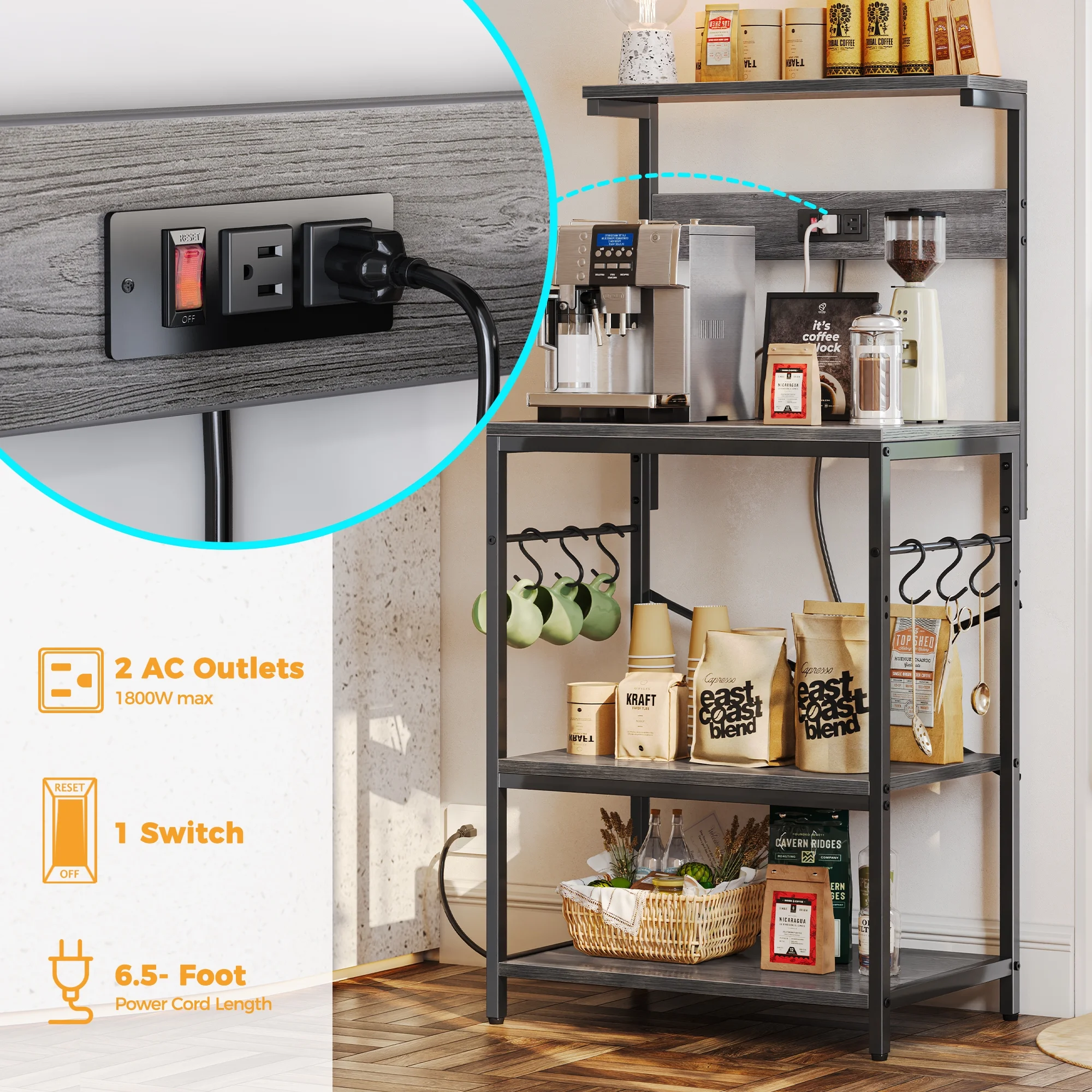 SUPERJARE Bakers Rack with Power Outlet, Kitchen Coffee Bar Table, Wood Microwave Stand with Hooks and Storage Shelves, Kitchen Shelf Rack, Charcoal Gray