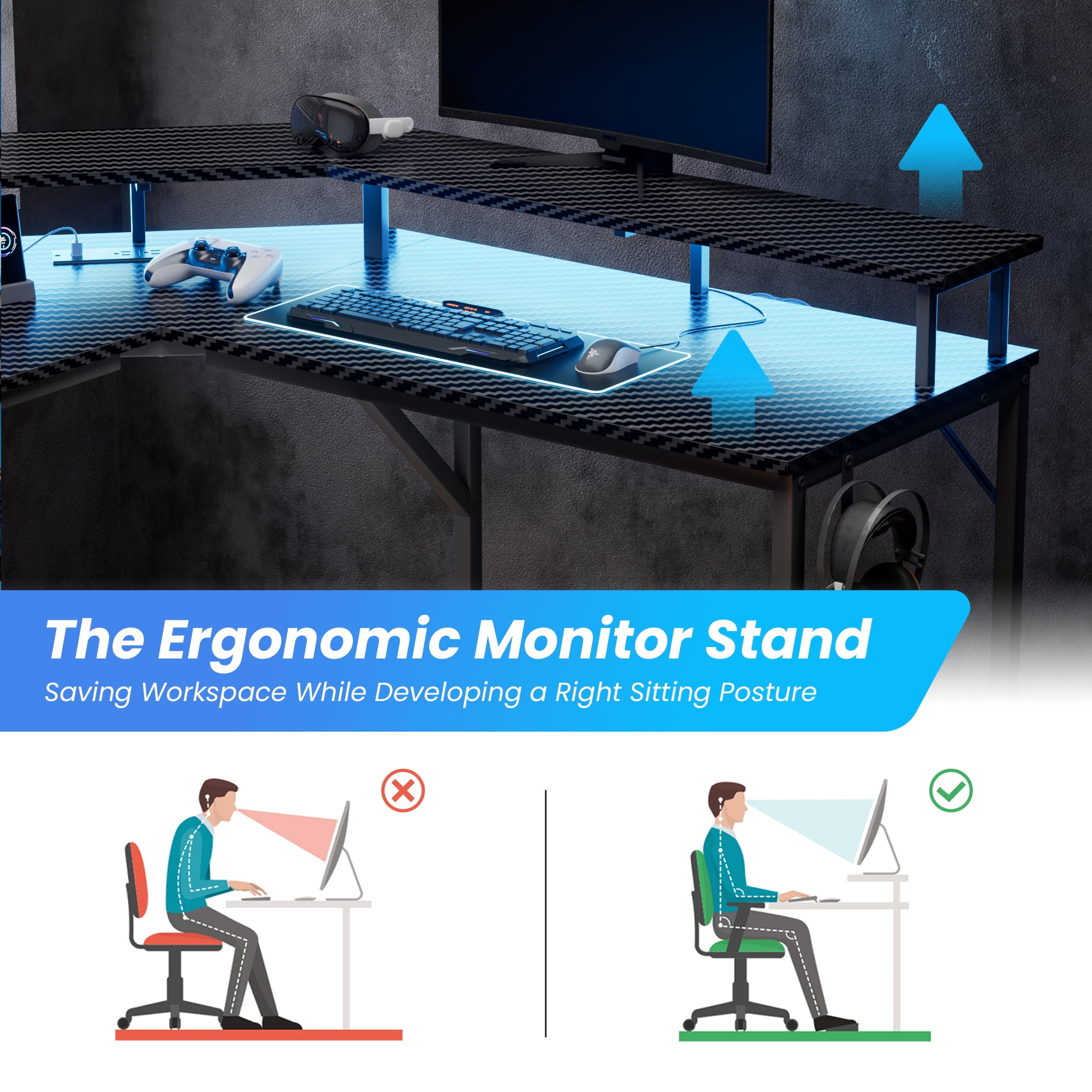 SUPERJARE Gaming Desk, L Shaped Computer Desk with Outlets and Monitor Stand, LED Gaming PC Office Desk Corner Desk with Hooks, 3D Carbon Fiber Black