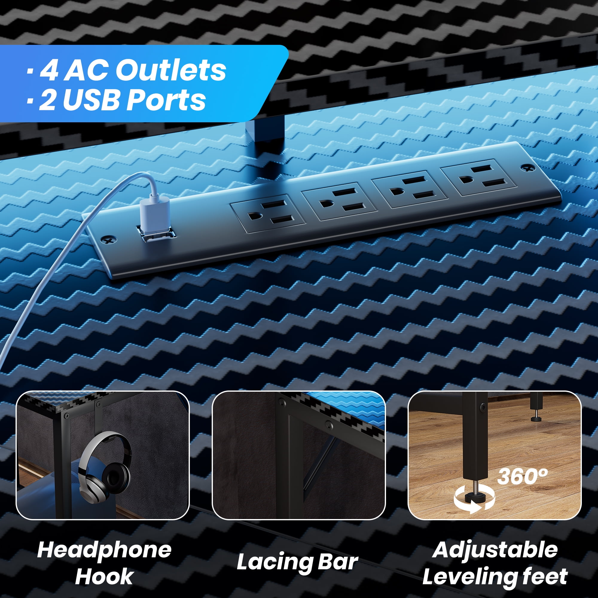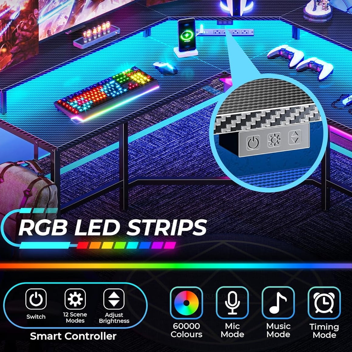 Elevate your gaming experience with this l shape gaming desk featuring dynamic LED lights. You can create the perfect gaming ambience with 20 colours, 22 modes, adjustable brightness, and flicker frequencies. The carbon fiber desktop of the l-shaped desk adds tactile feedback for an immersive feel. You can also stay powered up with 4 AC outlets, 2 USB ports and 1 Type-C Port on the desktop, reducing wire clutter. Plus, enjoy ergonomic comfort with a built-in monitor stand on the corner computer desk with storage, which reducing strain while adding more space for your gaming items. The headphone hooks keep your headphones within reach whenever you need them. This l shaped gaming desk with led lights is not just for gaming; it’s a versatile addition to any home or office as a writing desk, or a study desk. It delivers a reliable and comfortable environment for all your needs, whether gaming, work, or study. All components are labelled, tools are provided and comes with clear instructions, this home office desk is also easy to assemble.