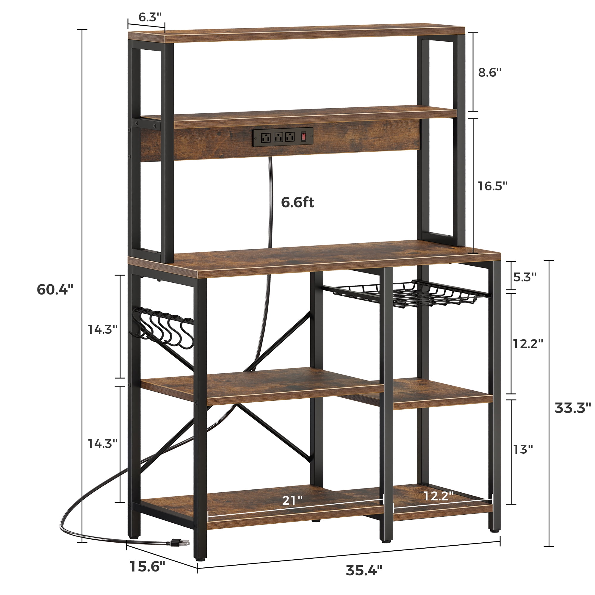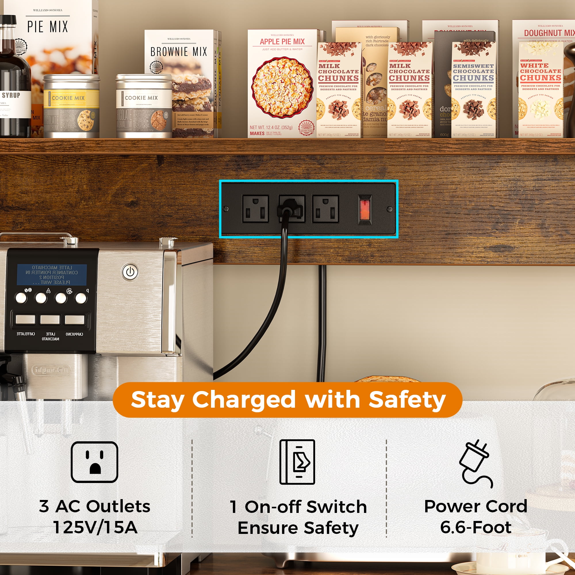 Charging Station: This kitchen shelf rack offers 3 AC outlets and an on-off switch, providing convenient power access and safety. Multiple Storage Shelves: With 2 shelves for spices, a spacious desktop for appliances, and hooks for ladles, this bakers rack makes everything easily accessible. Versatile Uses: Its versatility allows for use as a microwave stand kitchen shelf, display shelf, coffee bar, or plant table. Solid Construction: Crafted with durable materials and balanced adjustable feet, this sturdy organizer shelf ensures reliable storage for your kitchen appliances. Easy Assembly: With straightforward assembly instructions and included tools, you can quickly build this timeless kitchen or living room piece.