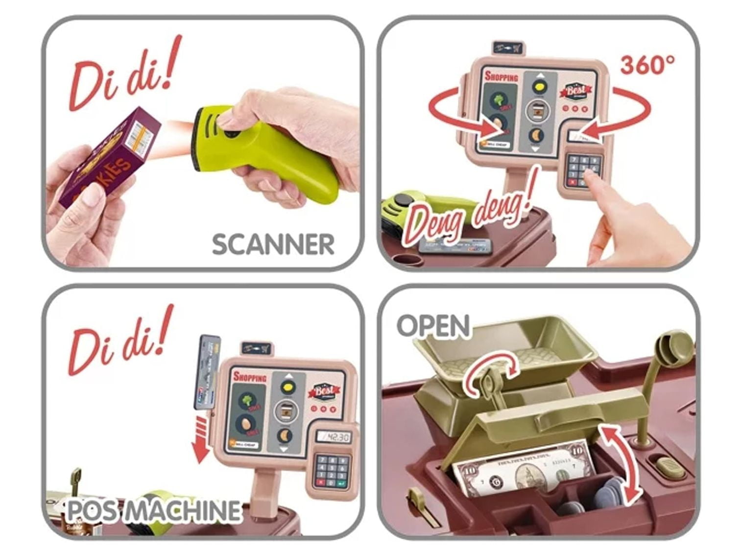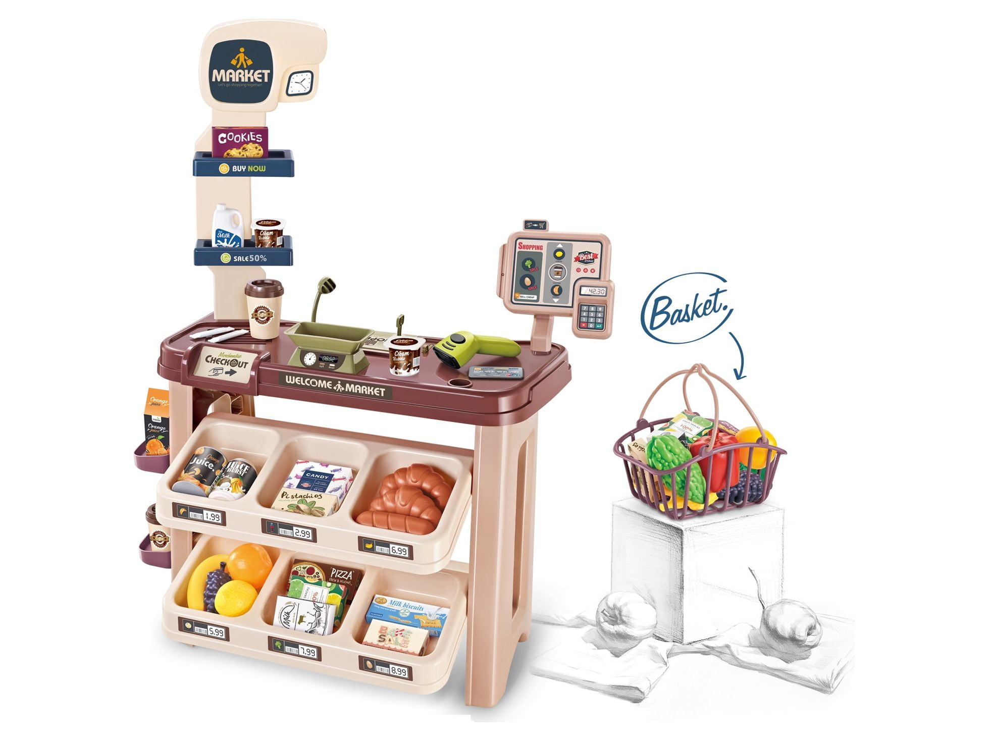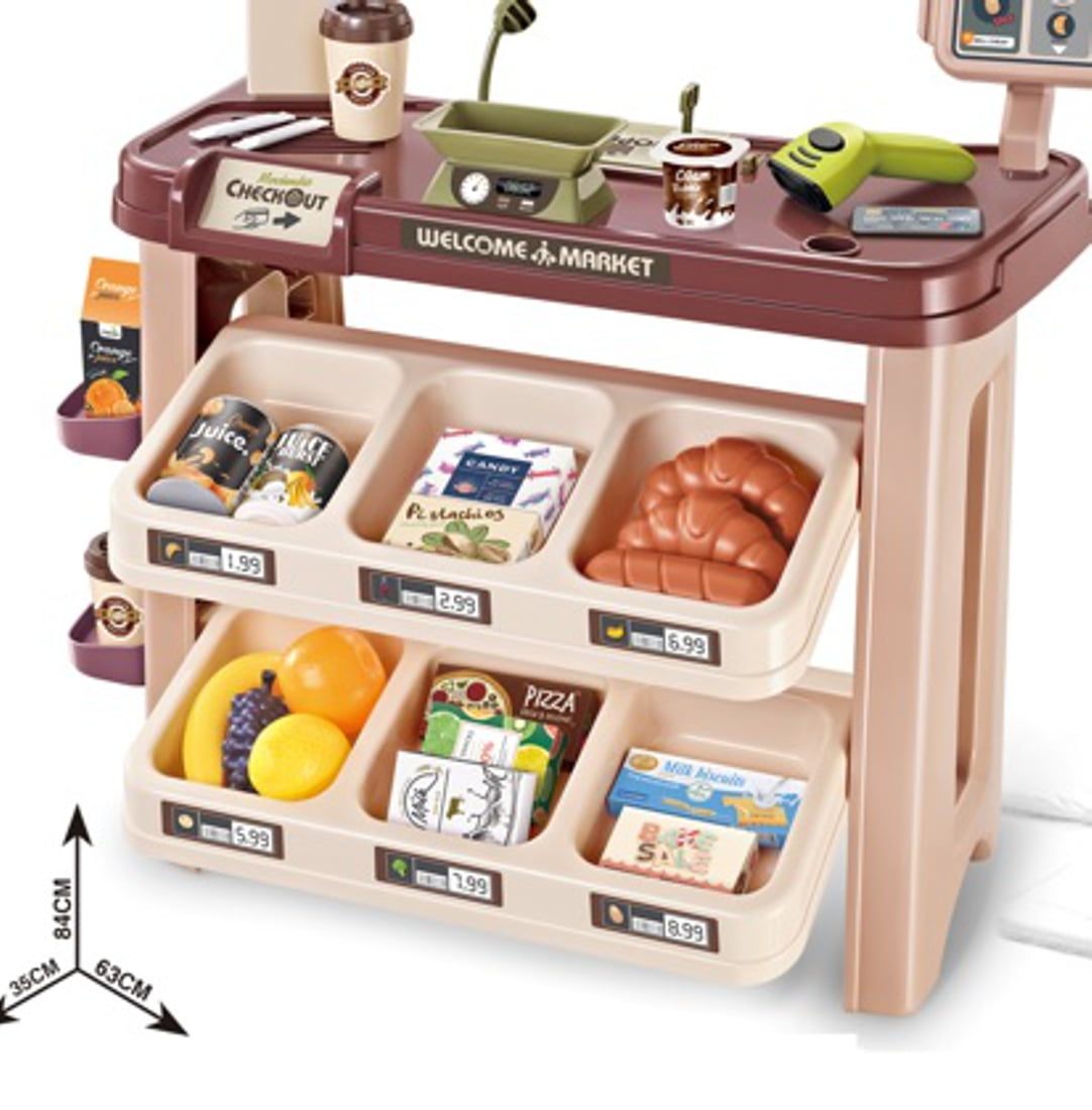 The kids can buy, choose the products from the shelves, pay them with a card or cash, weigh the fruit and vegetables, collect, scan, coffee shop, 58 pcs for Kids. Supermarket Set Dimensions: 13.78L x 24.8W x 33H in. Ideal size for toddlers who like to shop. Preschoolers can choose their purchases, put them in the cart and play with another child who can pretend to be the supermarket cashier!. The cashier can pretend to use the scanner, and charge at the cash register!. Coffee shop and more 58 accessories for Kids. This compact and colorful toy supermarket will make a great gift for children and is large enough that multiple kids can play at once!. Develops logical thinking, hand and eye coordination, shape identify, social skills and more. Colorful supermarket for children over 3 years old.