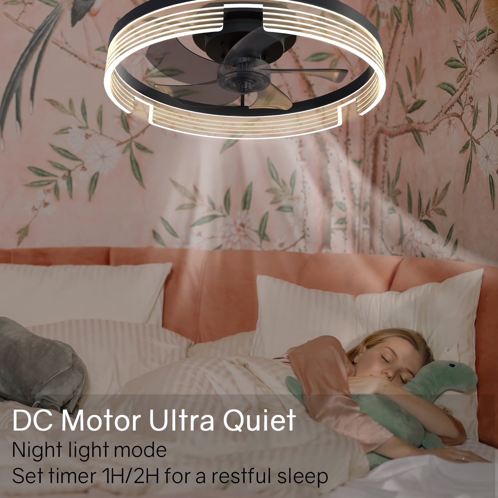Dimmable LED Light: This flush mount ceiling fan light with bluetooth APP & remote control dimming. Modern low profile design electric ceiling fans with light to keep the interior home decorative and stylish. Safer & Multi-Speed: Smart enclosed ceiling fan lighting with invisible blades is safer than traditional ceiling fans, and has 6 wind speeds and timing to most needs. Reversible Motor: Available for all seasons. The fan’s DC motor runs smoothly, provides strong airflow, and has no noise. Night light mode can create a quiet and comfortable sleeping environment. Easy Installation: The round fixture is equipped with accessories, installed within a few minutes, can direct the cool air and is easy to clean. Wide Applicable: These small hanging fan lights are very suitable for an indoor bedroom, kitchen, living room, bathroom, hallway, office, cafe, kid’s room, dining room, bar, hotel, etc.