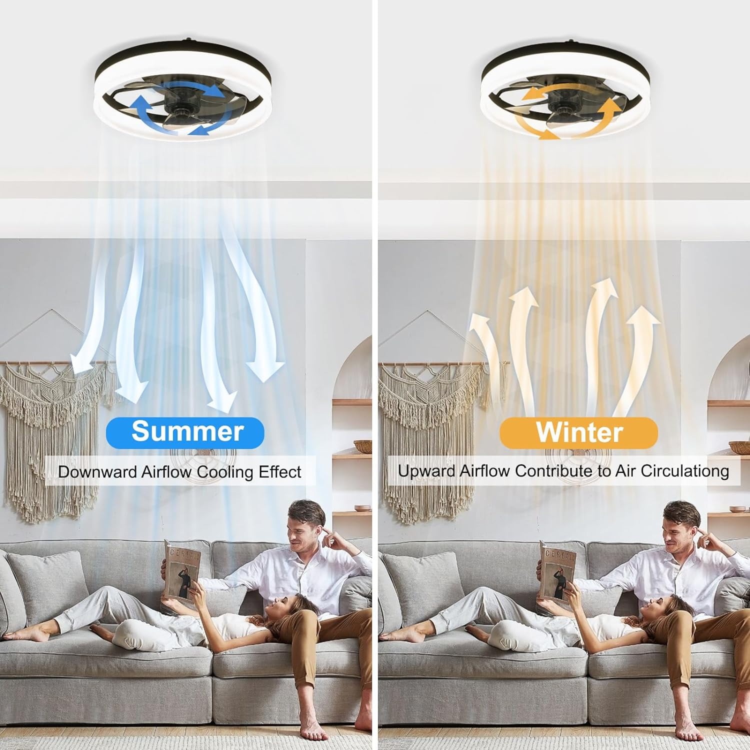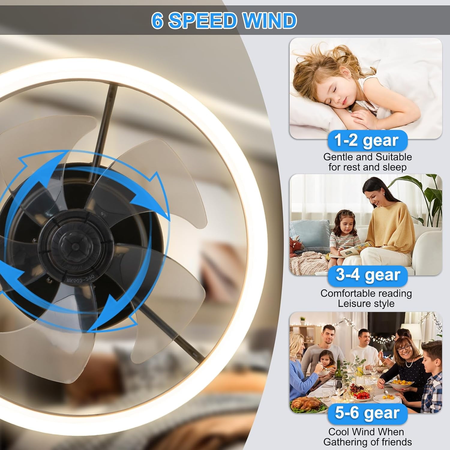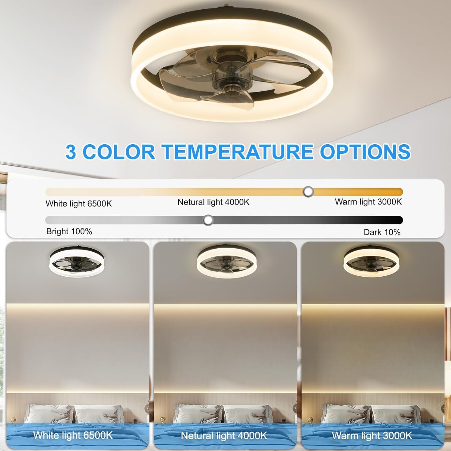 Surnie Ceiling Fans With Lights, allows you to adjust the brightness of the light and customize the color temperature by the remote and APP. Whether you need bright, cool lighting for a workspace or warm, cozy lighting for relaxation, led ceiling fan with light and remote provides versatile options to create the desired ambiance.