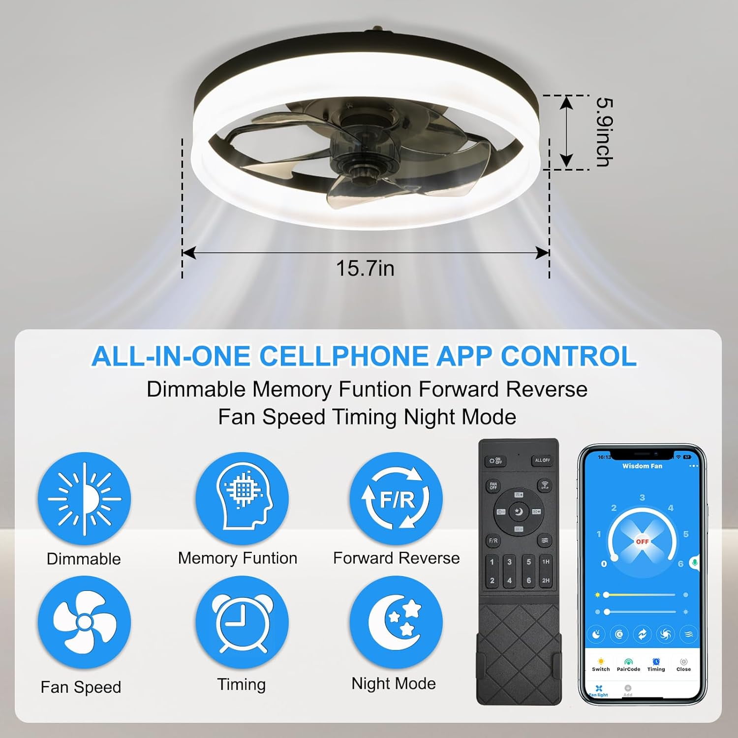 Surnie 15.7” Black Finish Modern Style Dimmable LED Flush Mount Indoor Bladeless Ceiling Fan