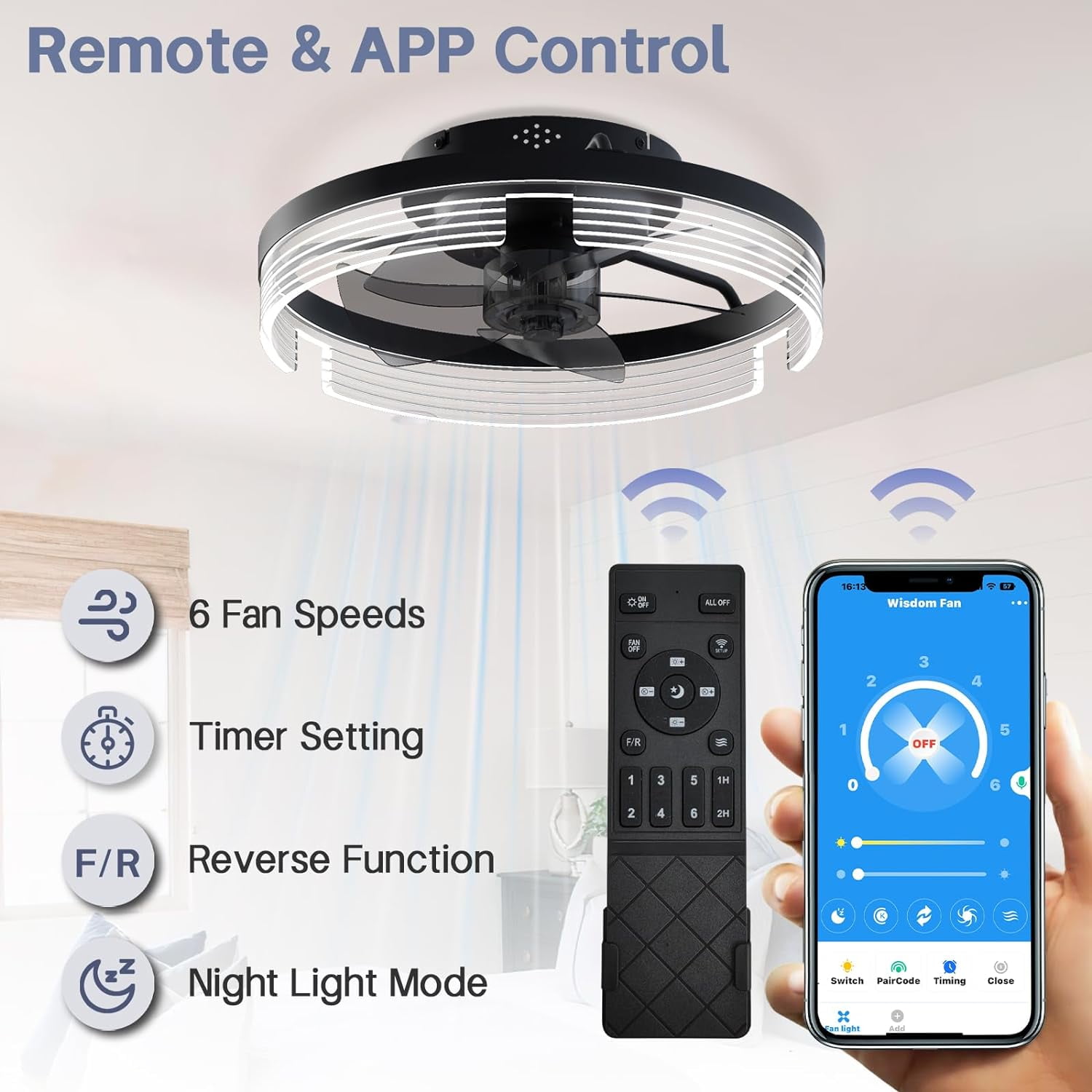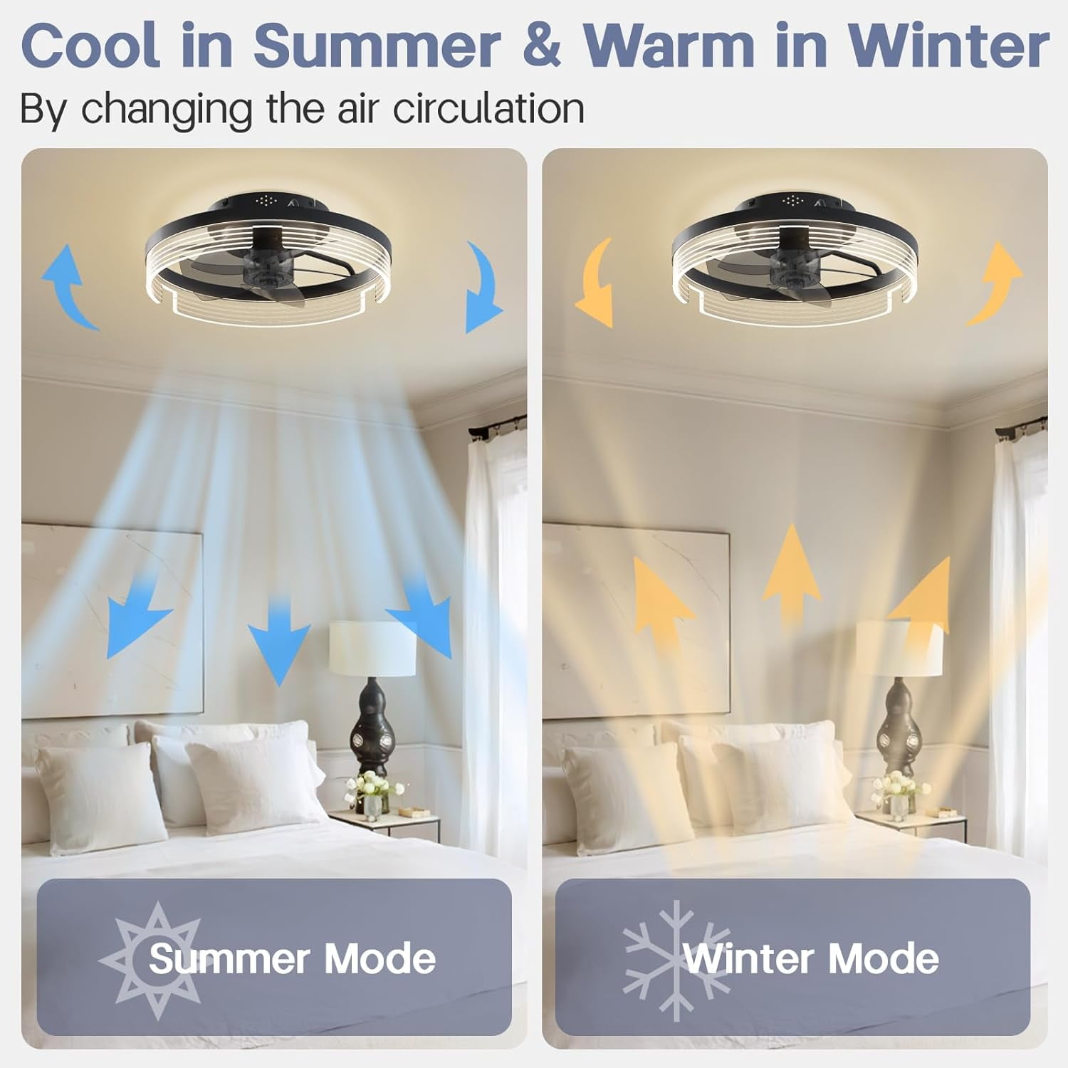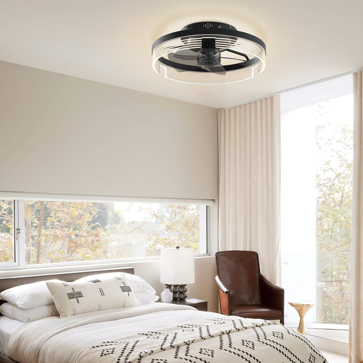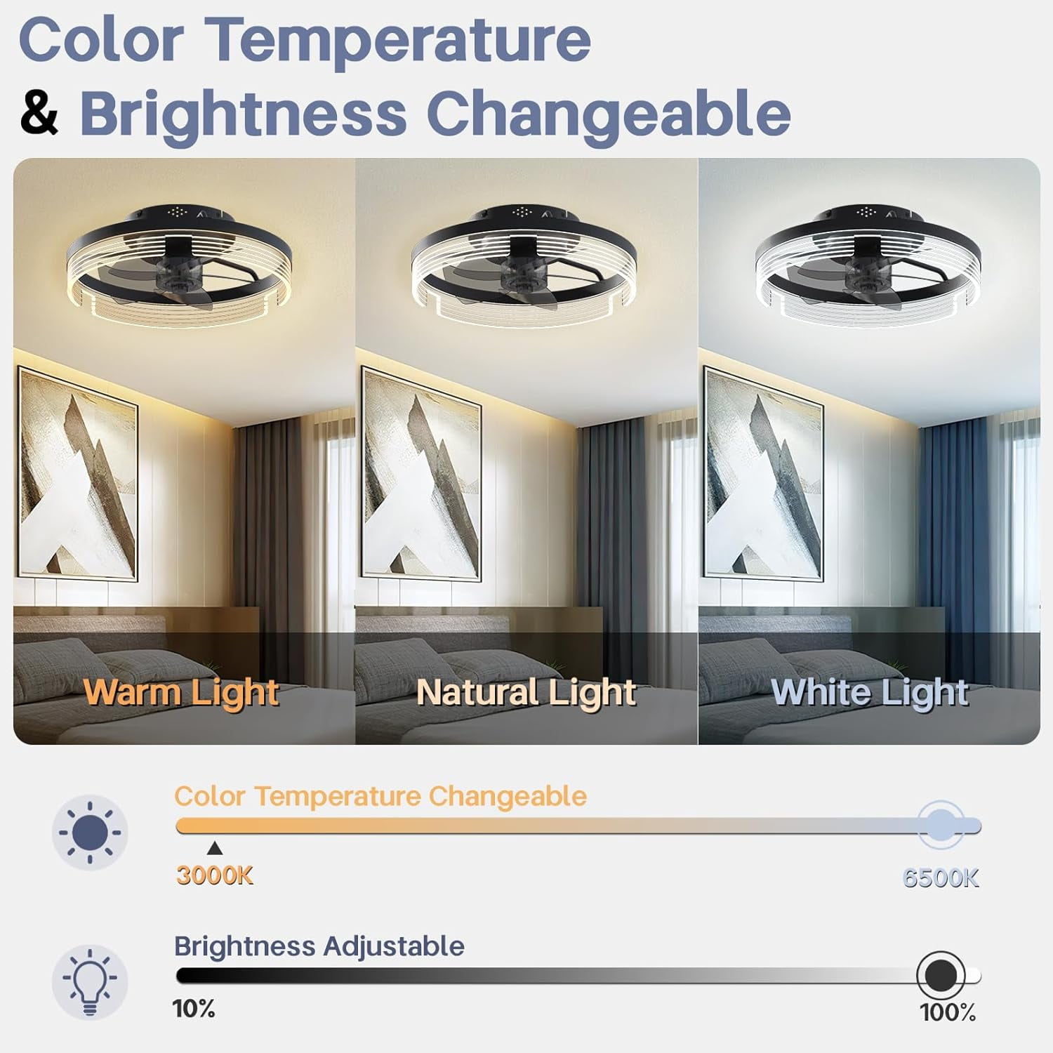 【Dimmable LED Light】: This 15.7″ ceiling fan with remote control dimming. Modern low profile ceiling fans with lights design lighting & ceiling fans to keep the interior home decorative and stylish. The LED energy-saving light has 3000K-6500K color temperature selectable, and light memory function. 【Remote Control & APP Control】: Smart bladeless ceiling fan lighting with invisible blades is safer than traditional flush mount ceiling fan with light, and has 6 wind speeds and timing. The remote smart control makes it easy to free your feet. (Tips: App control requires Bluetooth.) 【Reversible Motor】: Available for all seasons, the modern ceiling fan with light provides 2 airflow modes, promoting air circulation and saving energy. The flush mount ceiling fan’s motor runs smoothly, provides strong airflow, and has no noise, suitable for a 120 sq ft room size. The small 15.7″ low profile ceiling fan with light night light mode can create a quiet and comfortable sleeping environment. 【Easy Installation】: The instructions we provide contain detailed installation steps that can be installed within a few minutes. The ceiling fans with lights and remote can direct the cool air and are easy to clean. The lights and fans can be controlled separately or same time, depending on your preference. 【Wide Applicable】: These hanging bladeless small low profile ceiling fan with light is very suitable for an indoor bedroom, kitchen, living room, bathroom, hallway, office, cafe, kid’s room, dining room, bar, hotel, etc. 【Buy with Confidence】: We provide a 1-year warranty. If you have any issues please feel free to contact us, and we will give you a satisfactory reply.