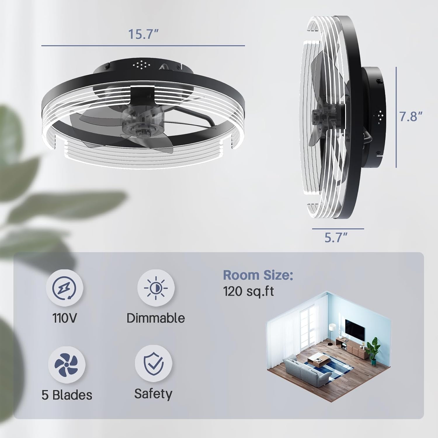 This 15.7″ ceiling fan with remote control dimming. Modern low profile ceiling fans with lights design lighting & ceiling fans to keep the interior home decorative and stylish. The LED energy-saving light has 3000K-6500K color temperature selectable, and light memory function.