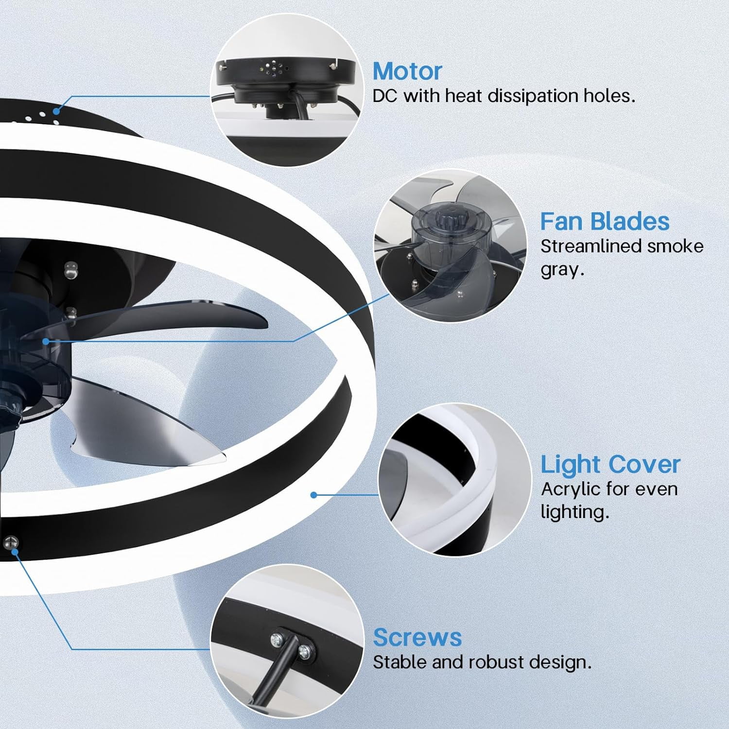 𝙎𝙡𝙚𝙚𝙠 & 𝙎𝙖𝙛𝙚 𝘿𝙚𝙨𝙞𝙜𝙣: Uniquely weighing just 4 pounds with 5 ABS blades, this low profile fan light is safer and lighter than traditional models. Its robust airflow comes from a smooth and quiet AC motor, ensuring exceptional bedroom ceiling fan performance. Equipped with a gentle, glare-free 20W dual-layer LED light source, it cares for your eye health.