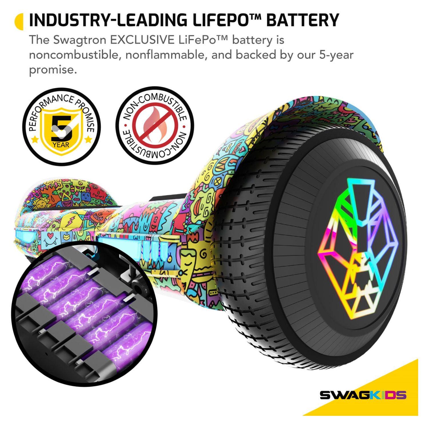 Tired of bland hoverboard designs Then let your personality shine with the swagBOARD EVO Freestyle. Fun, quirky cartoon characters transform your ordinary ride into an epic adventure! The vibrant and fun colors pop, showing off your unique style as you zip through the neighborhood. And best of all, it has all the features you expect from SWAGTRON: wireless speaker, light up LED wheels, and a safety-first focus with exclusive, UL-compliant LiFePo battery technology.