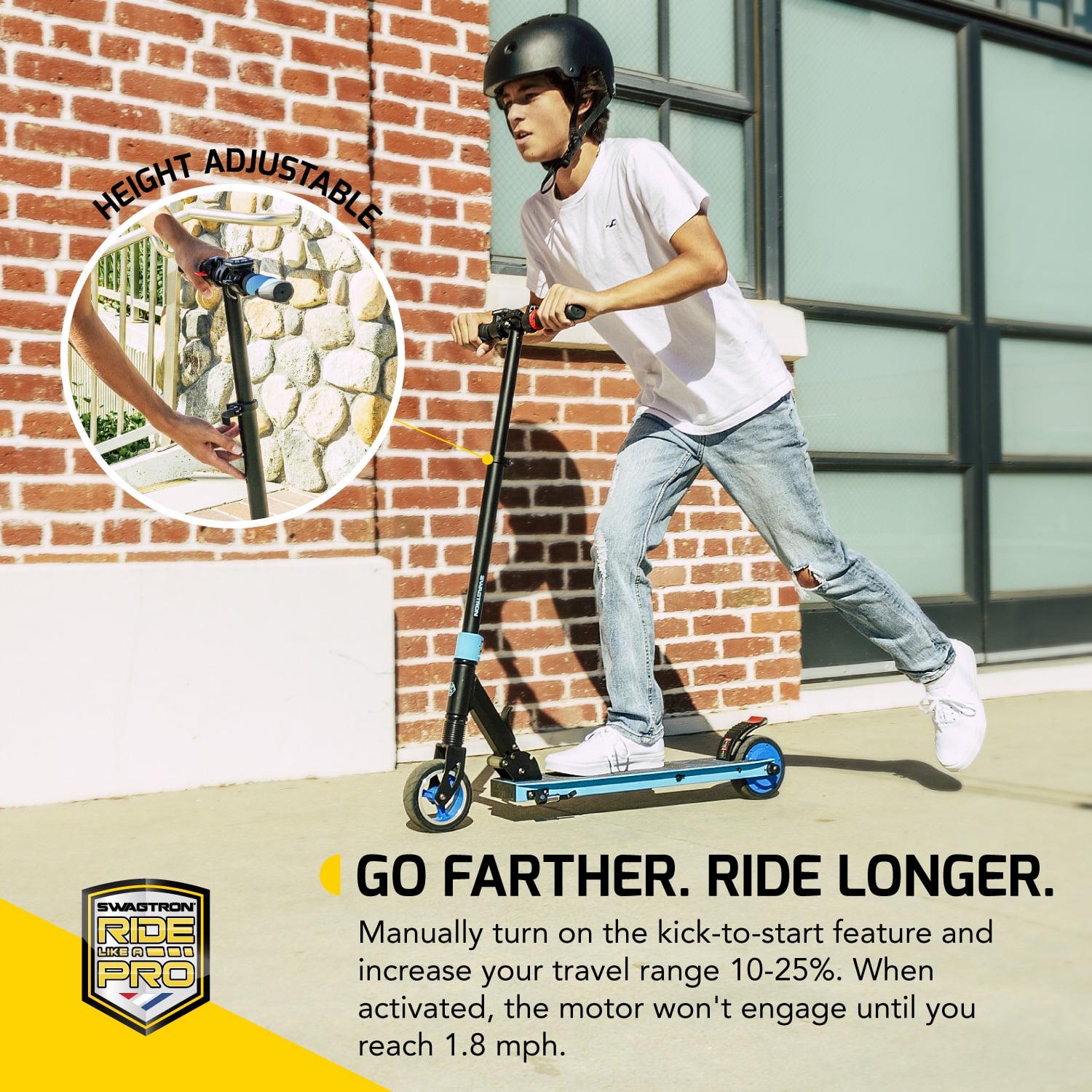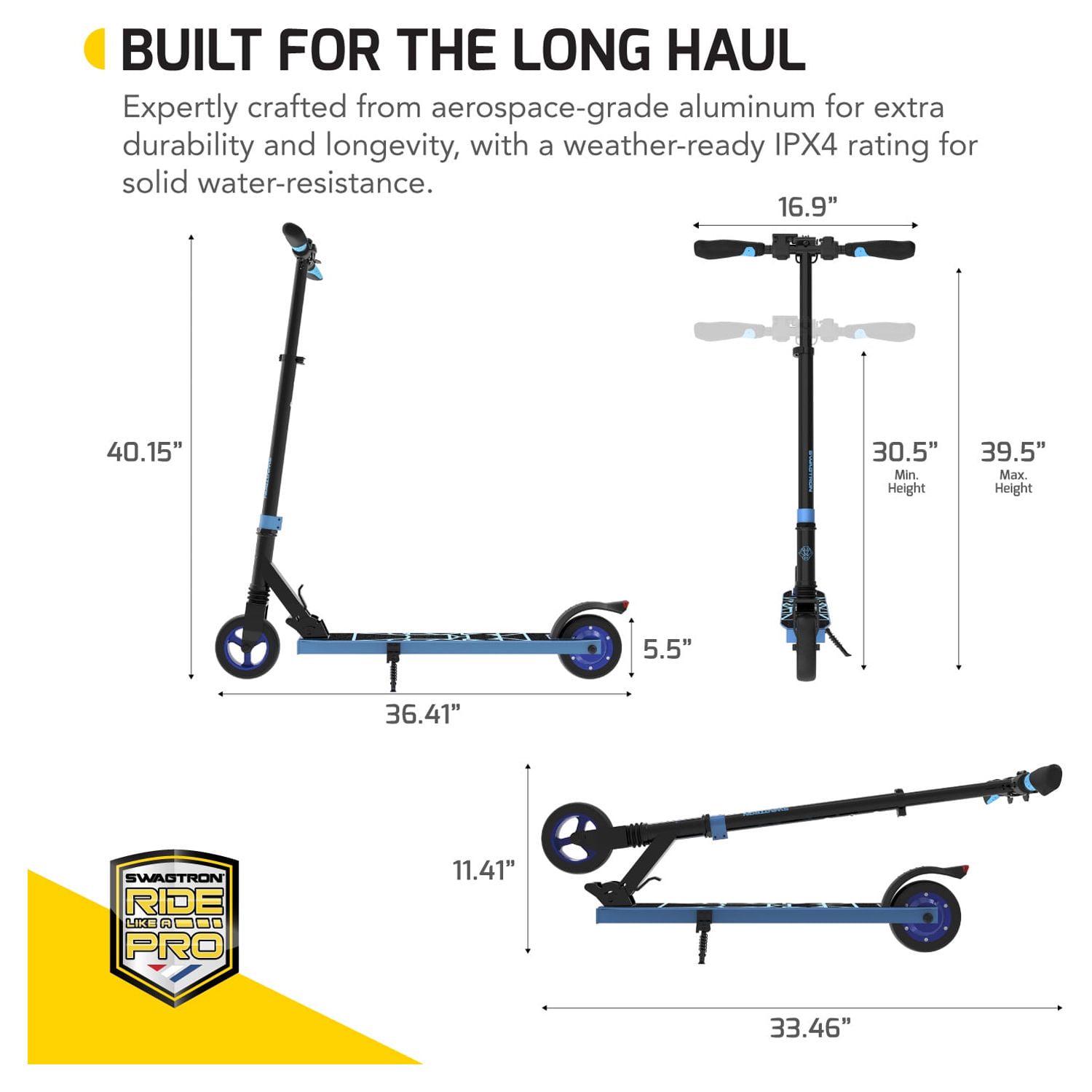 The swagger-8 from Swagtron, is an ultra-lightweight, whisper-quiet folding electric scooter for kids, teens, and young adults, UL 2272 Certified. Its design was well-Thought out with a rider-first focus that let us craft an extremely durable powered scooter with an ultra-quiet rear hub motor. With its adjustable stem, the swagger 8 has extra longevity that other electric scooters in its class simply can’t match. Raise the handlebar to let the scooter grow as the rider grows, or simply adjust the height to maximize comfort. After all, a comfortable ride is a perfect ride, and with the swagger 8, riding is believing. It does so without adding a lot of extra bulk. Electronic scooter when you need to dash, hop on the bus, or store it in compact spaces. 5.5-inch rubber tires naturally absorb micro-impacts of bumpier rides. Front coil-sprung suspension evens things out, even more, turning every ride. This kid’s electric scooter is powered by an efficient battery and ultra-quiet motor that work in perfect harmony with each other. While the battery and motor work together to ensure maximum efficiency and power output, we’ve added other enhancements to get the most out of this scooter. Maintain a consistent speed for 6 seconds and swagger 8 automatically engages cruise control. Once manually activated, this battery scooter feature reduces fatigue for riders and optimizes battery usage for longer rides. The swagger 8 electric scooter is everything you want in an electric-powered scooter durable, feature-rich, and exciting. Perfect for parents whose kids are ready for electric exploration, but who still want something with solid control and extra safeguards. Performance-based specs can vary depending on factors including riding style, terrain, rider weight, and more.