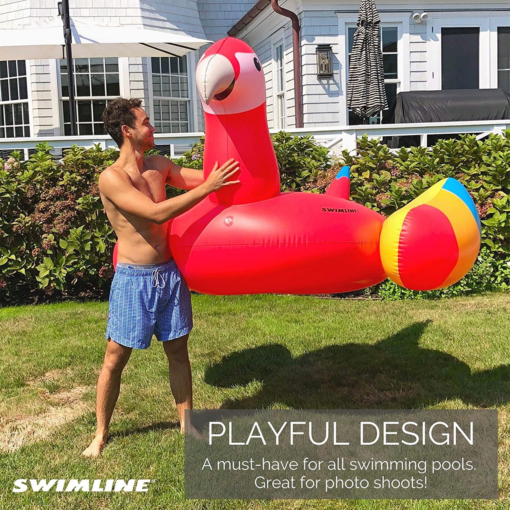 {OVERSIZED DESIGN} This Original Ride-On Parrot float features an extra large base design, providing plenty of room for lounging & relaxation. Perfect for 1 to 3 individuals looking for a spacious & comfortable way to relax & play in the water {PRIME COMFORT} The float mat features a buoyant, inflatable base to sink into for ultimate comfort while soaking up the sun. Various portions of the pool float were strategically designed to double as a head rest as well, for unmatched relaxation. {EXTRA STABLE} Its wide base, grab-on neck, & bolstered legs / wings ensure stability & balance, so you can enjoy your time in the pool with peace of mind. You won’t have to worry about tipping over / losing balance while lounging on Swimline lounges