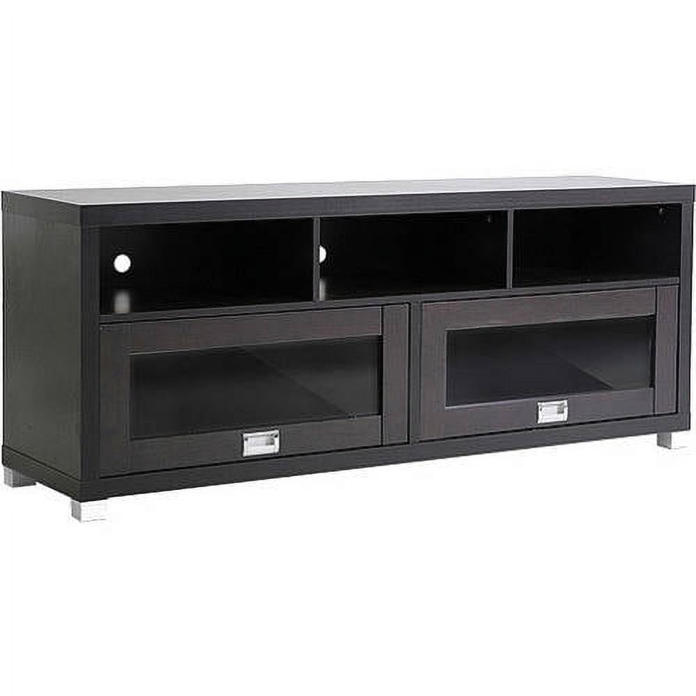 Swindon Modern Dark Brown TV Stand with Glass Doors for TVs up to 60″: Fits most flat panel TVs up to 60″ up to 150 lbs Contemporary style 2 sliding overhead-style doors with glass panels Silver drawer pulls and legs Holes in rear for easy cable management Material: wood and glass Dark brown paper-wood effect veneer Some assembly required Dimensions: 57.63″L x 15.63″W x 23.38″H Model# FTV-885