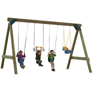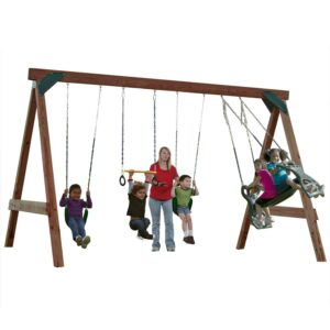 Just add lumber and wood screws for the perfect swing set on a budget. The ScoutSwing Set Hardware Kit by Swing-N-Slide is designed for the Do-It-Yourself family. Customize this traditional A-frame design with three different design options. This kit includes 2 swing seats, ring/trapeze bar, swing hangers, and hardware. Each swing can support up to 115 pounds. All projects feature ample room for 4 different swing elements, so you can keep your kids active throughout the year. Further customize your swing set by adding a toddler swing, stand-up swing, or glider (all sold separately).