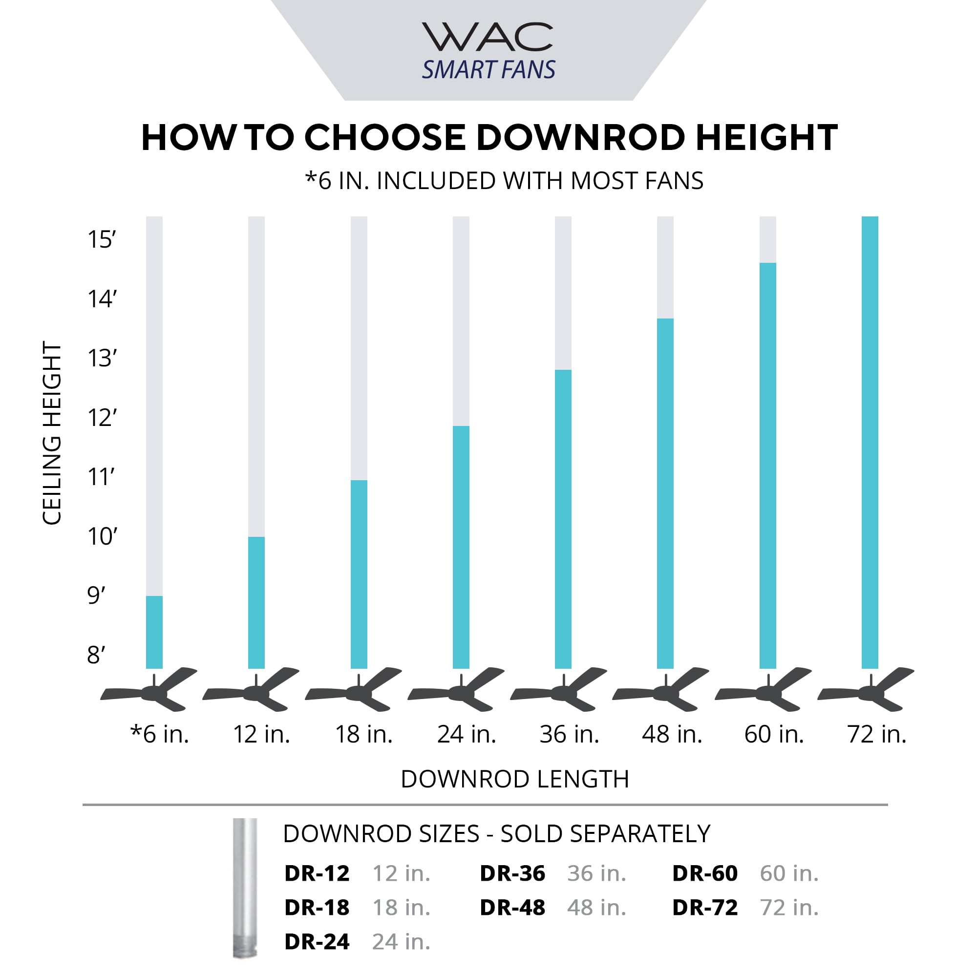 Features: WAC Lighting ceiling fans can be enabled with an iOS or Android app purchase to pair with the smart home tech you know and love Battery operated Bluetooth remote control with wall cradle included Made with incredibly efficient and completely silent DC motors up to 70% more efficient than traditional fans and tested to ensure each fan will never wobble, rattle or click Constructed from Aluminum Fan is controlled by a Remote Control (included) Can be installed on sloped ceilings, max slope 30 deg Not low ceiling adaptable Includes 1 x 0.75″D X 6.0″H down rod Integrated dimmable LED lighting Uses an energy efficient reversible 25-watt DC motor Ratings: ETL, cETL, UL, cUL, CSA Canada and Wet locations Energy Star certified California Title 24 certified Covered under a manufacturer warranty of 5 years (LED), lifetime (motor), and 1 year for all other parts Dimensions: Blade Span: 54in Height: 12.11in Housing Width: 7in Product Weight: 20lbs Canopy Width: 7in Wire Length: 80in Blade Specifications: Number of Blades: 3 Blades Included: Yes Reversible Blades: No Blade Pitch: 24 Degrees Blade Material: ABS Motor Specifications: Speeds: 6 CFM (H/M/L): 5650/3419/1187 (cubic feet per minute) RPM (H/M/L): 162/101/40 Reversible Motor: Yes Motor Wattage: ABS watts Light Kit Specifications: Lumens: 1600 LED Color Temperature: 3000K Wattage: 19.5 watts Average Hours: 50000 Dimmable: Yes