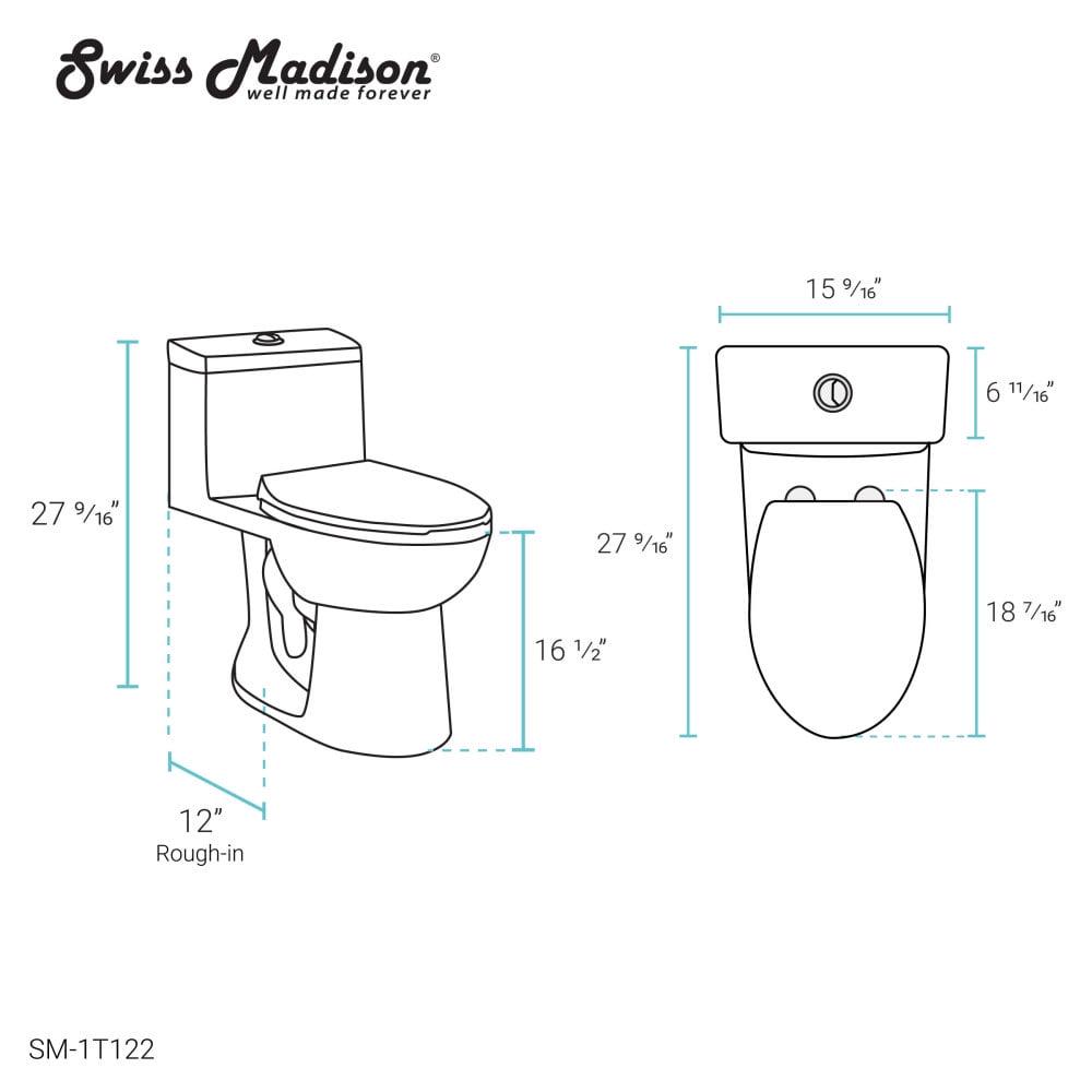 The Swiss Madison Avallon One-Piece Elongated Toilet possesses a clean, distinct design that will enhance any bathroom setting. The dual-flush function offers the ability to conserve water without compromising performance. Dual-flush with high-performance gravity 1.1 / 1.6 gallons per flush (GPF). Elongated bowl offers added room and comfort. Includes Tank, Bowl, Seat, Wax Ring, Bolt Kit and Cover Caps. Dimensions: 27.56′ in. x 15.56′ in. x 27.56′ in.