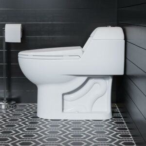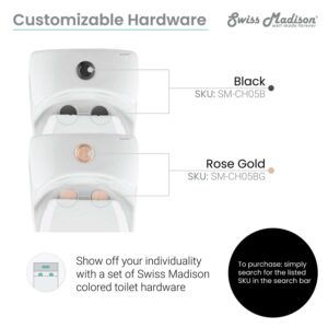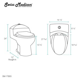 The Swiss Madison Château One Piece Elongated Toilet Dual Flush features a modern design with an ergonomic curved back. Its dual-flush function conserves water without compromising on power and it features a soft-close quick release toilet seat. Dimensions: 19.56′ in. x 16.13′ in. x 24′ in.
