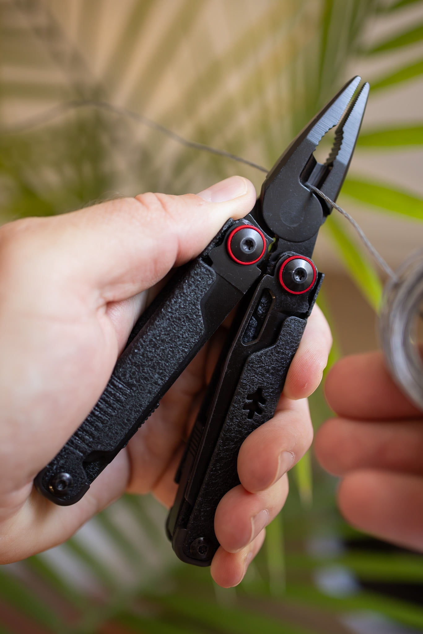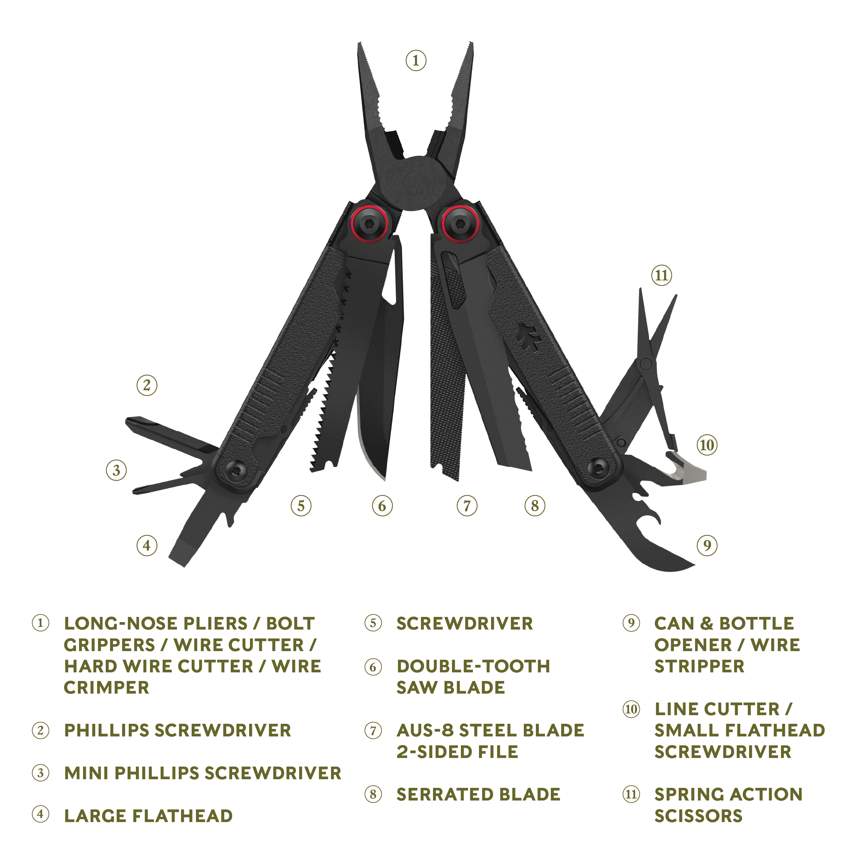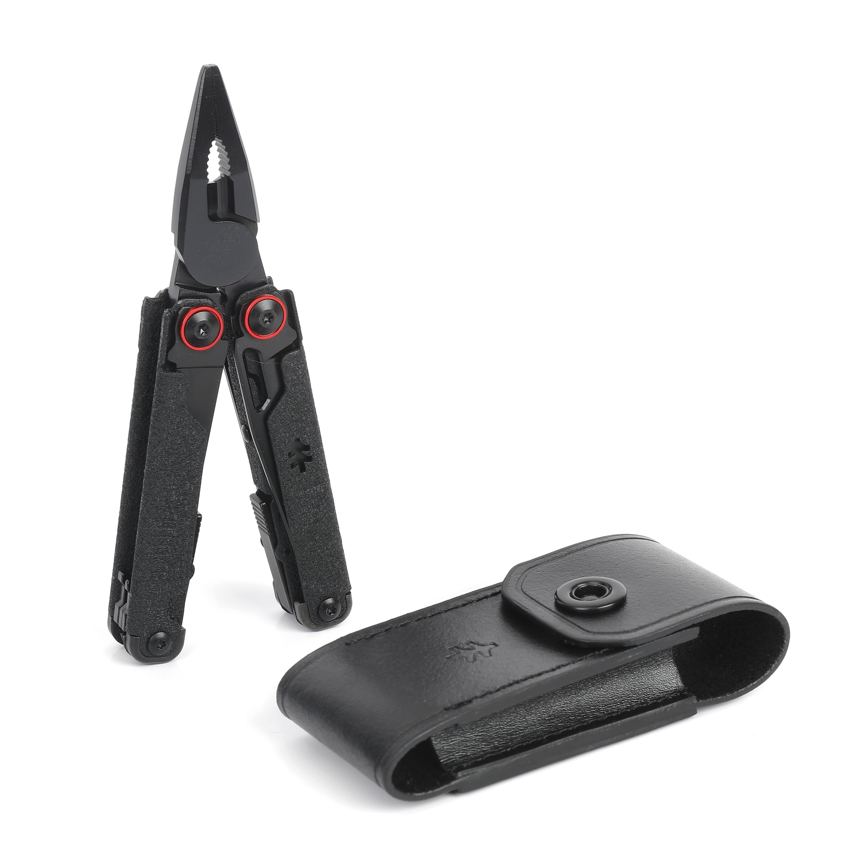 Swiss Tech Aus-8 Steel 17-in-1 Folding Black Multi-Tool with Leather Sheath, Multi-Function AUS-8 steel knife blade Can and bottle opener combined with wire stripper for opening cans and removing unwanted wire insulation Sharp and controllable spring action scissors for precise cutting Serrated blade for cutting through rope, fabric, or soft foods like bread and fruit Double-tooth saw blade for sawing through wood, fabric, and tough materials Includes black leather sheath with belt loop Features outboard and inboard locking tools for added safety Butterfly design Built-in 2-sided file, Phillips screwdriver, mini Phillips screwdriver, small and large flathead screwdrivers, long-nose pliers, bolt grippers, wire cutters, and wire crimper 17-In-1 multi tool Non-slip, textured grip 0.47 lbs New