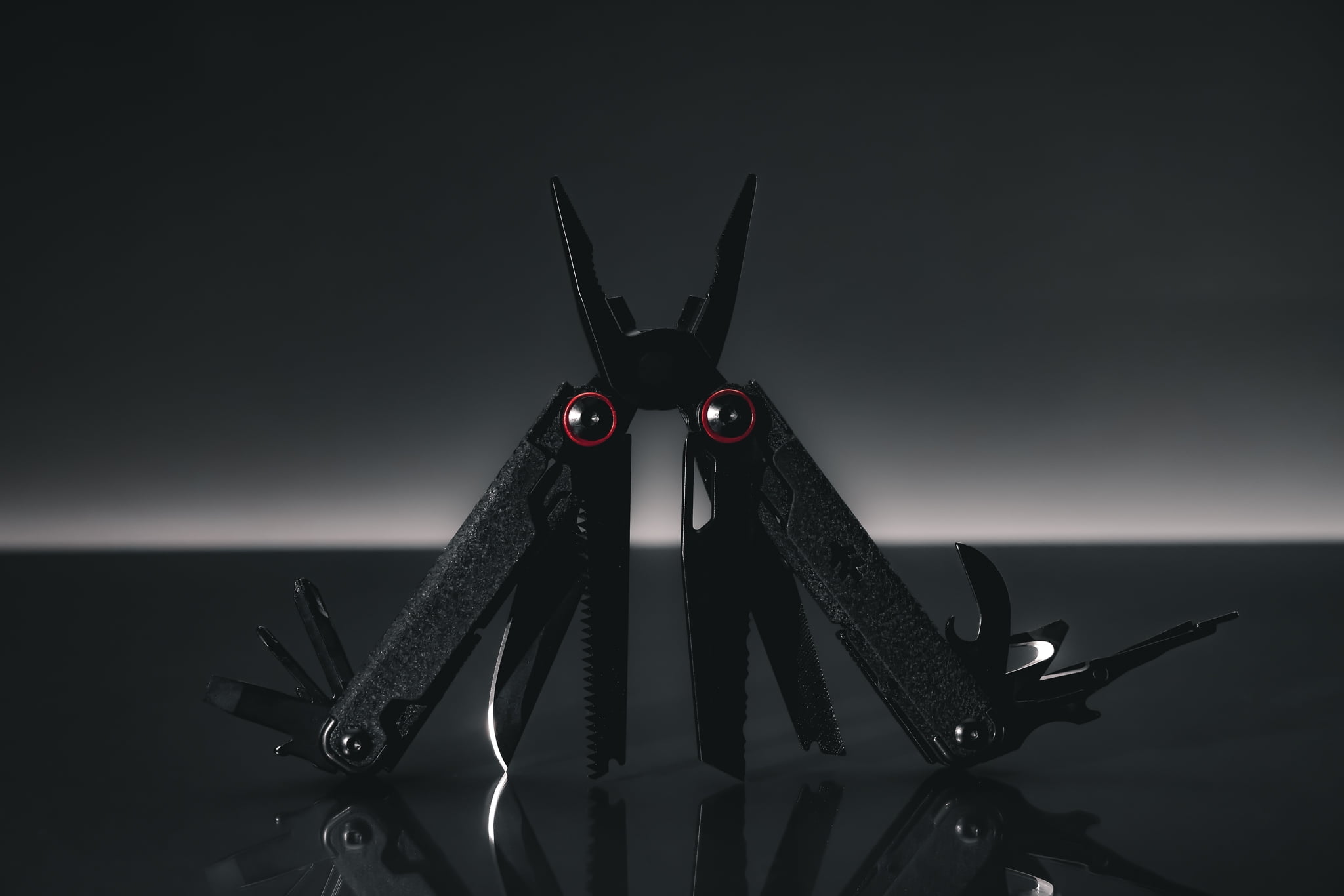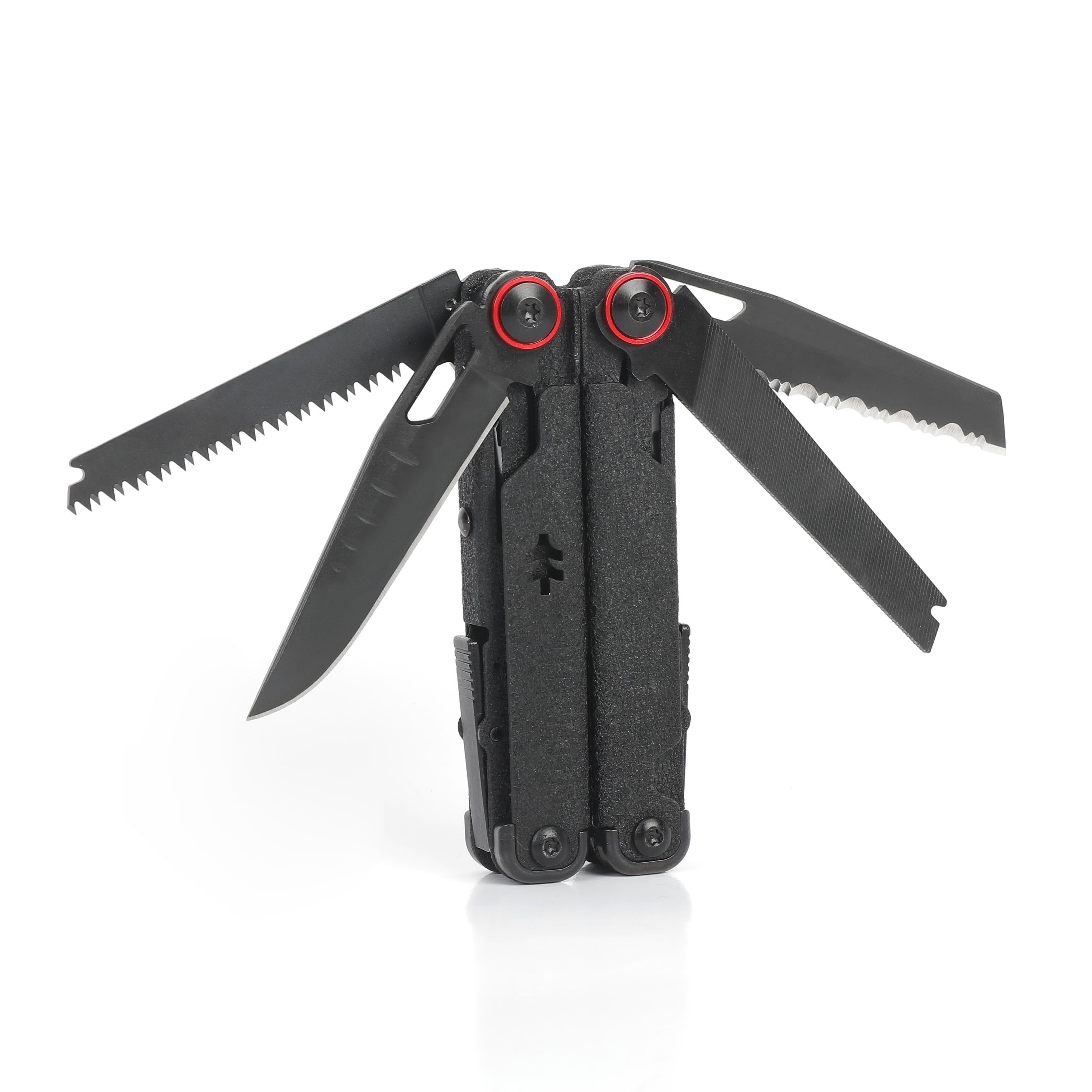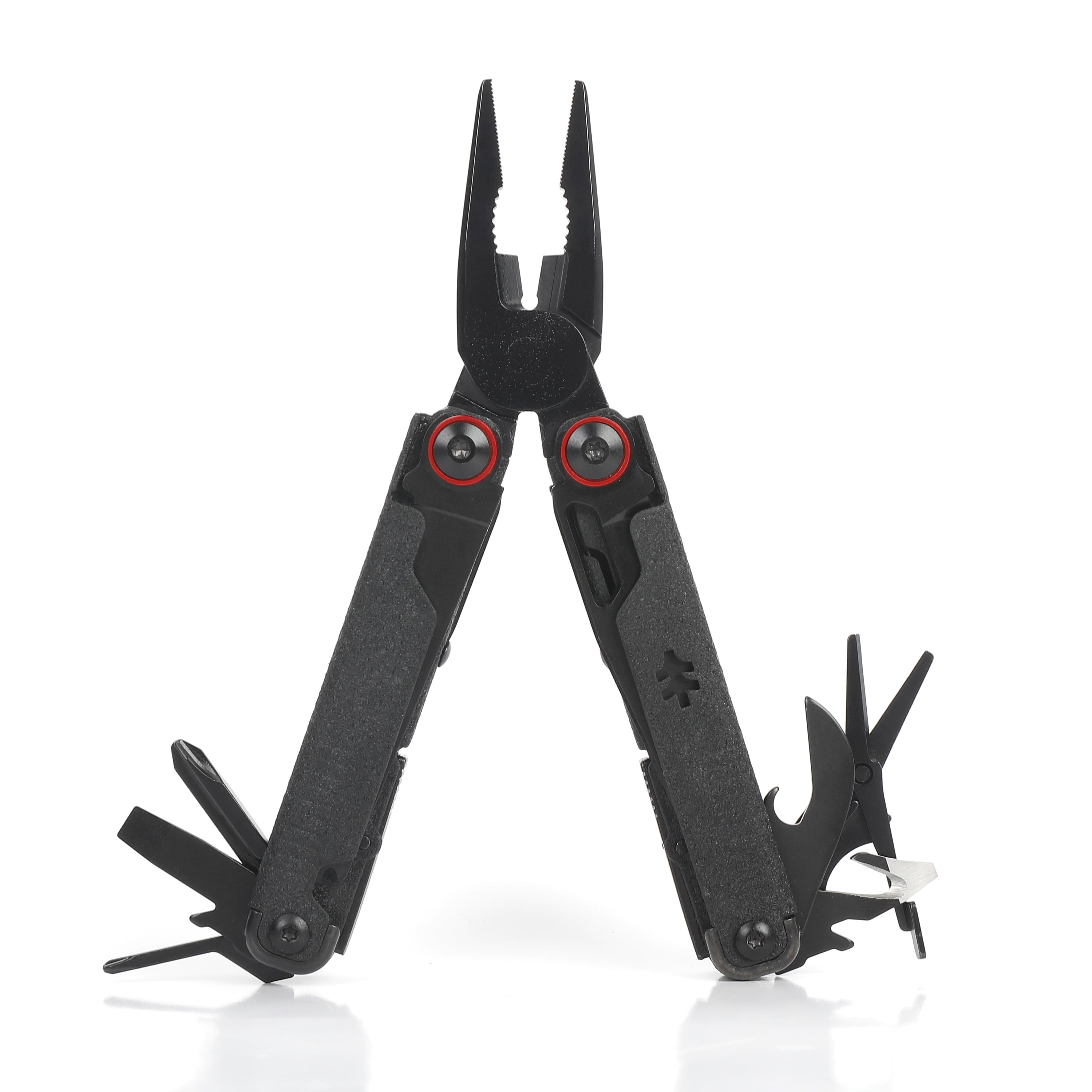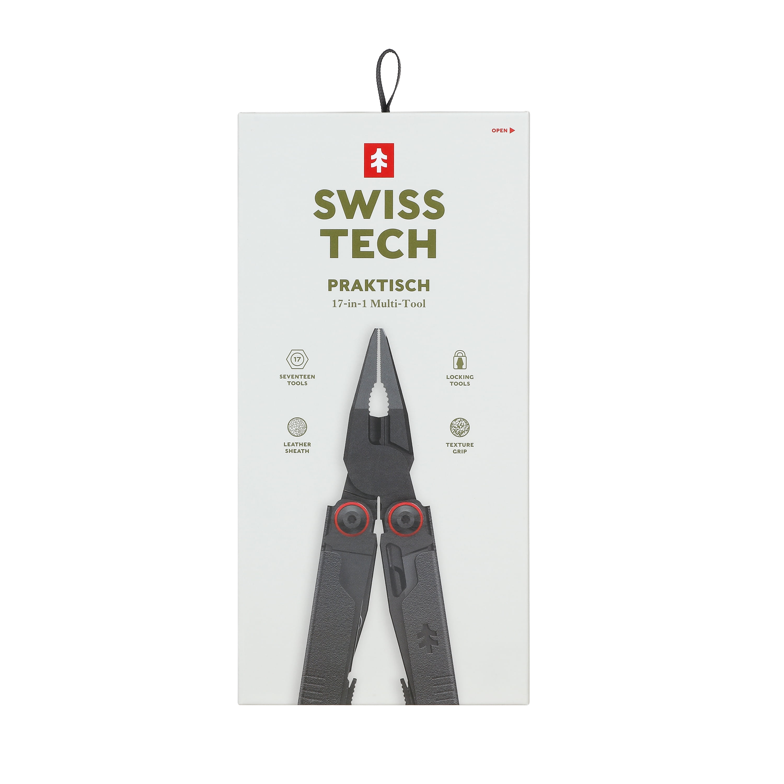 Introducing the Swiss Tech Praktisch Stainless Steel 17-In-1 Multi-Tool in black, a versatile classic reimagined. This new multi-tool features a sharp, AUS-8 steel knife blade for everyday tasks. It includes a serrated blade for cutting rope, fabric, and food, a double-tooth saw for wood and tough materials, a can and bottle opener with a wire stripper, and precise spring-action scissors. It also offers 4 screwdrivers, a 2-sided file, long-nose pliers, bolt grippers, wire cutters, and a wire crimper. Designed for practicality and built to last, it’s your all-in-one tool.