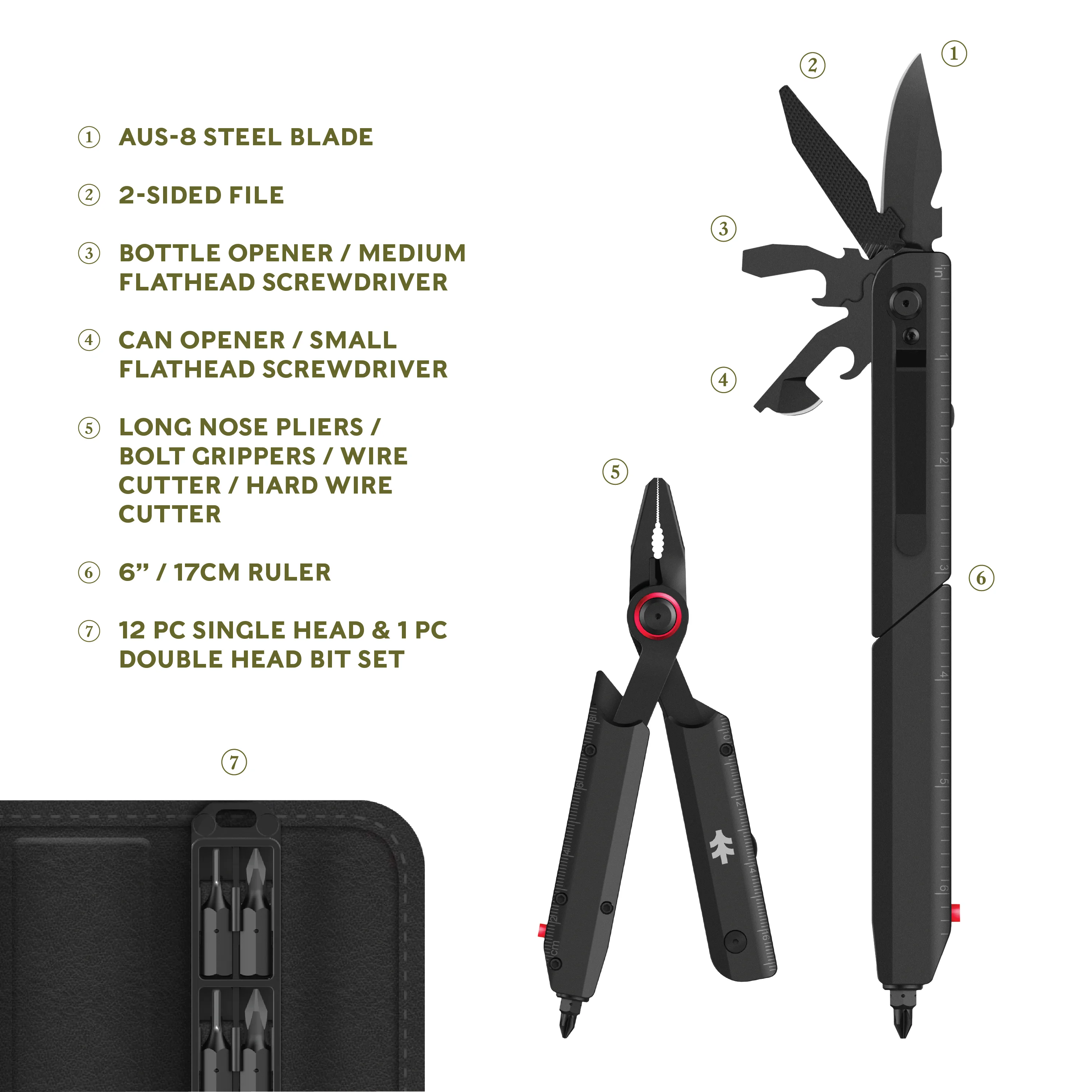 Swiss Tech AUS-8 Steel Blade 26-in-1 Folding Multitool Ultimate versatility and function all in one slim, compact design 6” ruler integrated into the handle for quick measuring Can opening combined with precision on flathead or slotted screws with the small flathead screwdriver Includes a bottle opener and medium flathead screwdriver for effortlessly removing a bottle cap and using on slotted or flathead style screws Built-in 12-piece single head and 1-piece double head bit set, long nose pliers, bolt grippers, a wire cutter, and a hard wire cutter Premium leather sheath and clip are included to provide convenient carry while embarking on all your adventures Perfect for camping, hunting, hiking, everyday use, and holiday gift giving New