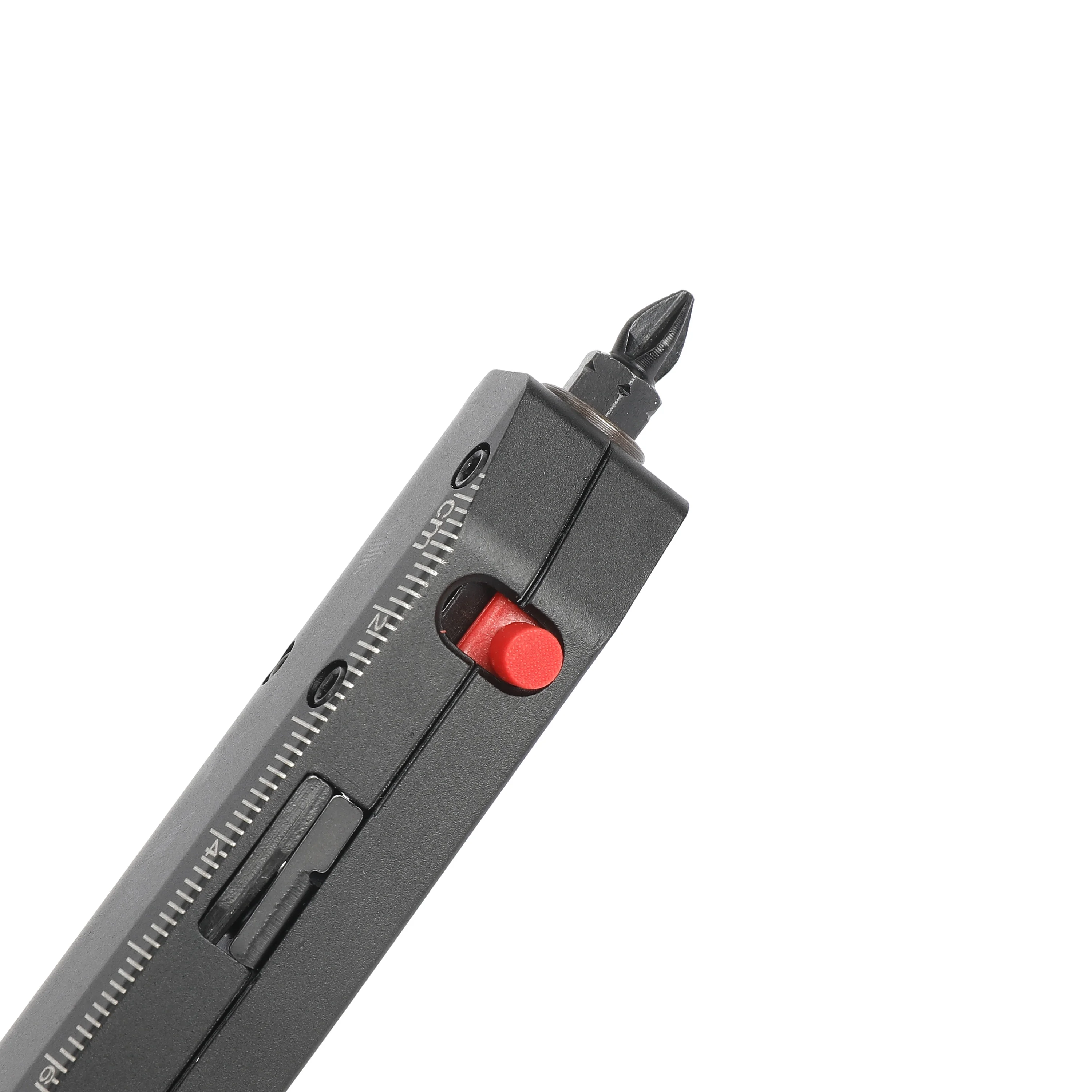 The Swiss Tech Taktstock Stainless Steel 26-in-1 Multi-Tool with Leather Sheath in black, a versatile and durable multi-tool in a slim, compact design. It features a sharp, AUS-8 steel knife for everyday use. The handle includes a 6” ruler for quick measurements. The multi-tool offers reliable can and bottle openers, small and medium flathead screwdrivers, a 12-piece single head and 1-piece double head bit set, long nose pliers, bolt grippers, 2 sided file, wire cutters, and a hard wire cutter. A premium magnetic leather sheath with tool and bit storage is included for convenient carrying. Compact and strong, the Taktstock Multi-Tool is perfect for any situation.