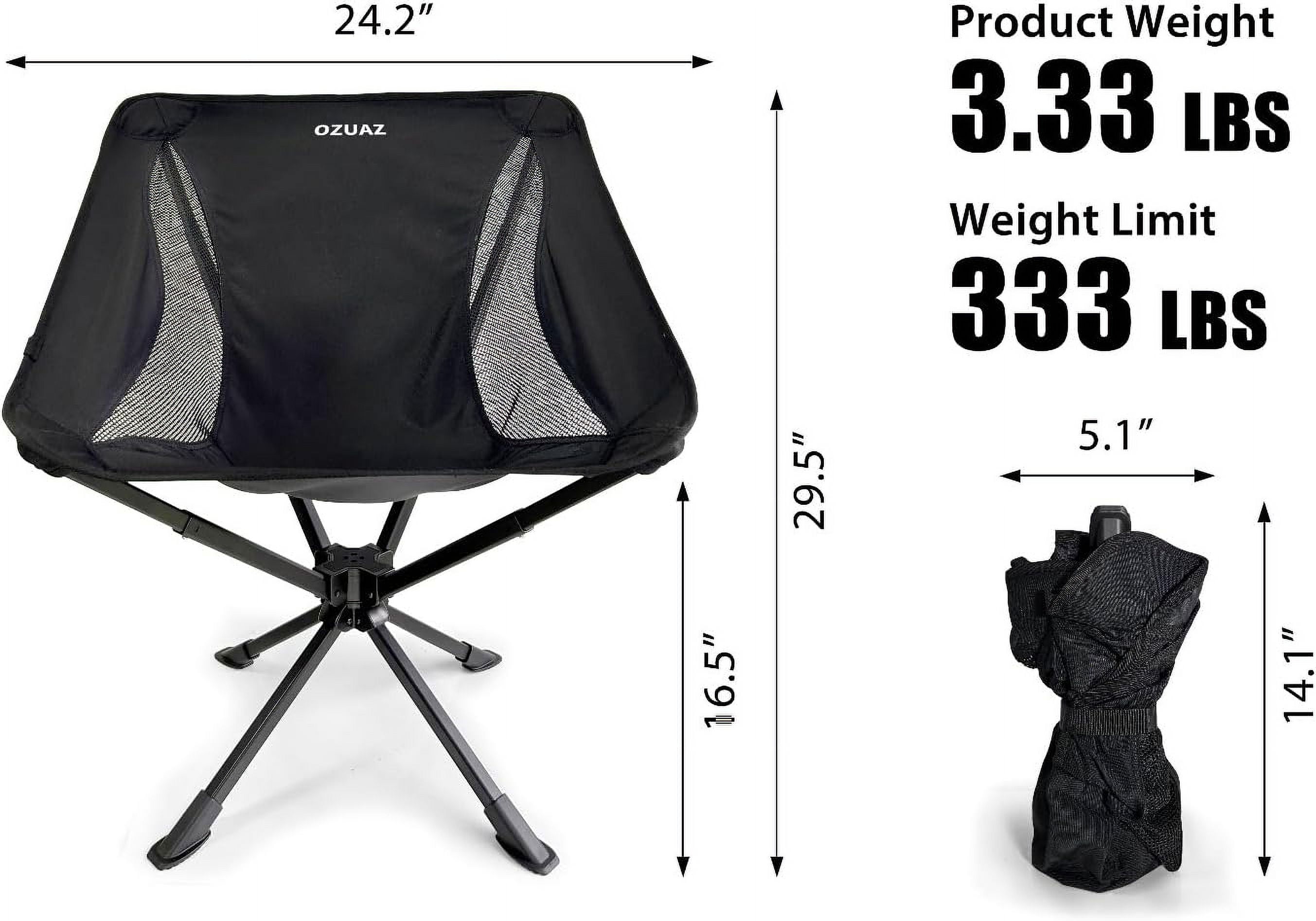 🎒Portable Chair: Your go-to companion for camping convenience. Crafted with portability in mind, our chair features a compact design that easily collapses to a size of 13.4” x 3.7” x 3.7”, making it incredibly easy to transport and store. Weighing only 3.55 LBS, it’s lightweight enough to carry on hikes or pack in your vehicle for spontaneous outdoor adventures. Plus, with its convenient carrying bag, you can take it anywhere and enjoy comfort on-the-go. ⏱️Crazy Fast Setup in 8 Seconds: Say goodbye to complicated assembly processes and hello to instant relaxation. Our folding chair boasts a remarkable setup time of just 8 seconds, allowing you to spend less time fussing with equipment and more time enjoying the great outdoors. Simply unfold the chair, extend it to its full length, and voila! No detachable parts means no hassle and no chance of losing essential components, ensuring seamless relaxation wherever you go. 🔄360° Swivel Smart Design: Elevate your camping experience with our state-of-the-art swivel chair. Designed for versatility, it allows you to effortlessly rotate a full 360 degrees, enabling you to find the perfect position for ultimate relaxation. Whether you’re enjoying the sunset, chatting with friends, or simply soaking in nature, our innovative swivel chair ensures enhanced comfort and convenience throughout your outdoor adventures. ✅Quality Craftsmanship by OZUAZ: At OZUAZ, we believe in delivering products that stand the test of time. That’s why our swivel chair is meticulously crafted from top-quality materials, including aircraft-grade aluminum, waterproof nylon, and sturdy stitching. With large anti-slip, wear-resistant feet providing stability, this chair is built to support up to 300 lbs, ensuring durability and reliability for all your outdoor escapades. Trust in OZUAZ for a lifetime of adventure-ready gear. 🏕️Your Adventure, Your Way: Swivel chair is the perfect companion for any outdoor excursion. Whether you’re camping in the wilderness, lounging on the beach, or fishing by the lake, this chair is designed to enhance your experience wherever you go. With its compact size and lightweight construction, you can easily take it hiking, picnicking, or attending outdoor festivals. Embrace the freedom to explore and make every adventure unforgettable with OZUAZ.