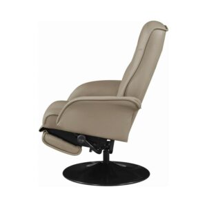 This gorgeous recliner is the ultimate in relaxation. Whether you’re relaxing with the morning paper or winding down after work, it’s perfect for comfortable lounging. Its soft, beige leatherette upholstery gives it a classic look. Ultra plush padding provides plenty of cushiony comfort. This recliner is complete with swivel functionality, adding versatile convenience.