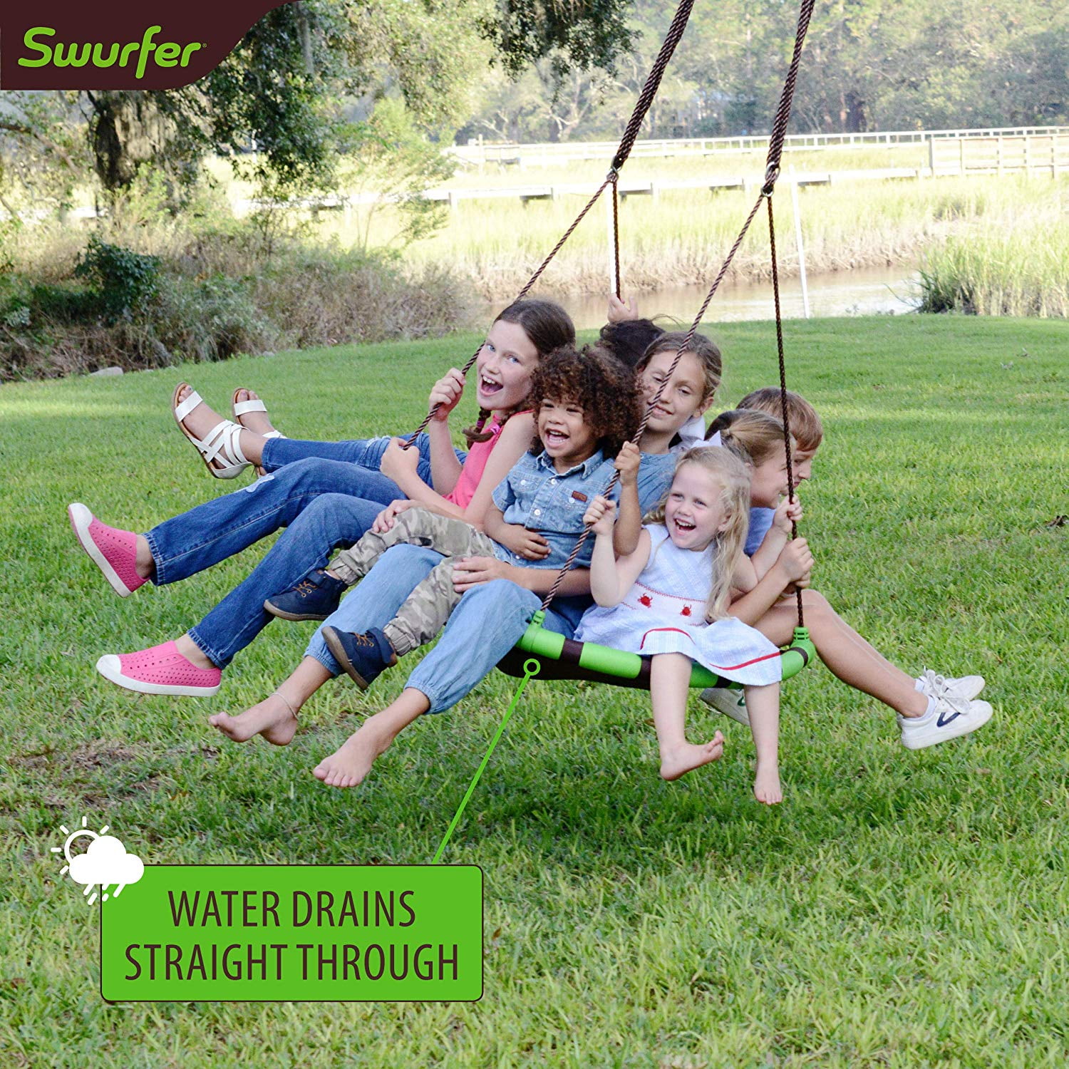 Swurfer Orbit 40″ Tree Swing, Cool Feel Mesh Padded Saucer Swing Holds Up To 500 lbs. Have an out of this world time with the Swurfer Orbit! This comfortable padded saucer tree swing looks good and feels good as kids and adults alike will enjoy swinging back and forth under the tree, taking naps, doing homework, or just lounging in the shade. Its giant diameter frame can support up to 500 lbs, so friends and family alike can pile onto it all at once. Its weather-resistant design is UV protected and water resistant, and its durable nylon mesh mat allows water to filter right through so it drains immediately. This mesh also allows air to flow through the swing to keep you cool on hot and sunny days while also strong enough to resist tears. Tool-free quick snap assembly means setting up the Swurfer Orbit is a snap.