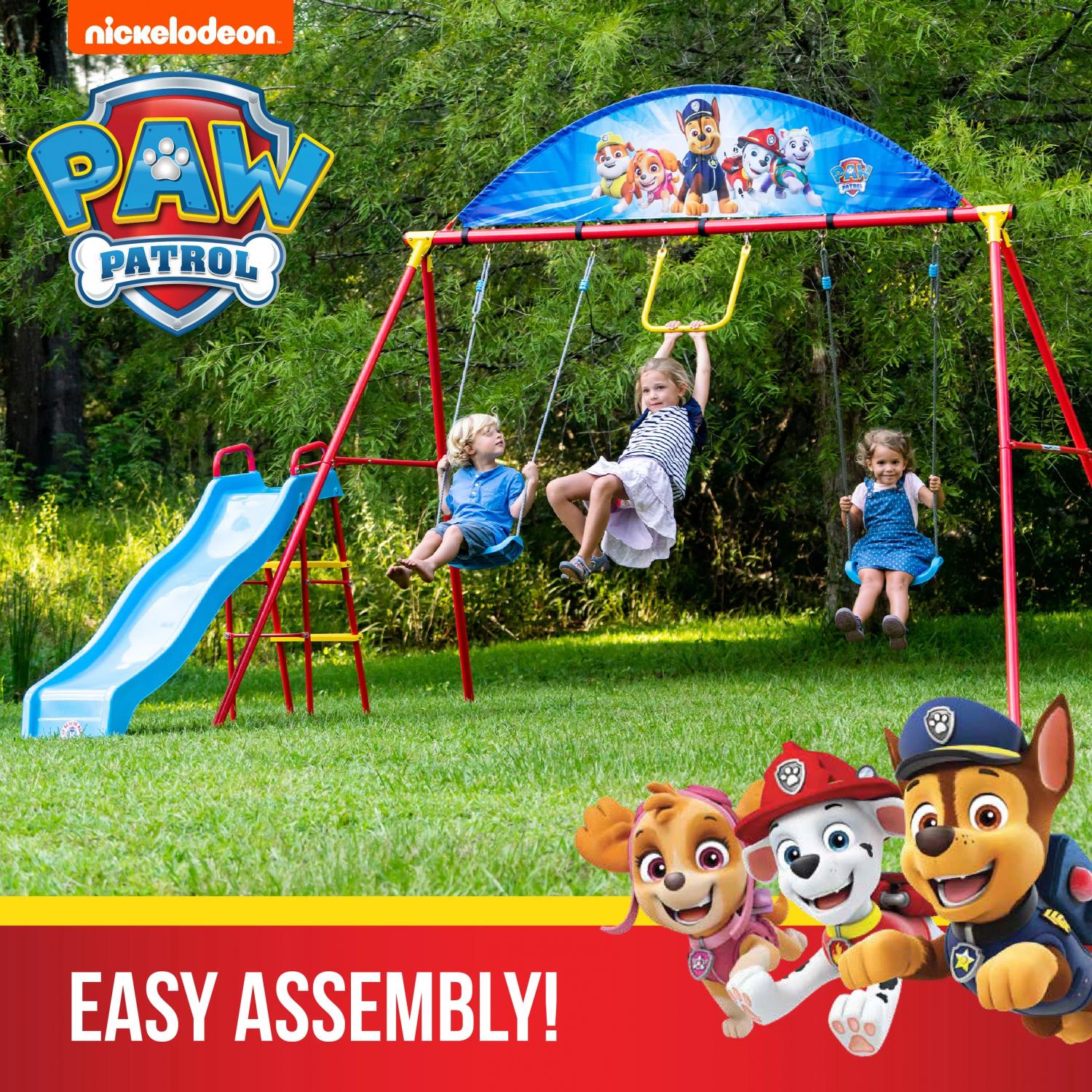Swurfer Paw Patrol Deluxe Swing Set for Kids, Ages 4 and up. Paw Patrol Swing Set by Swurfer is a complete activity that includes a slide, a trapeze, and two different swings. The Paw Patrol characters join the action-packed excitement this colorful metal swing set has to offer, as kids hang and swing from the trapeze, speed down the slide, or enjoy a steady classic swing. Get fired up with Chase, Marshall, and the rest of the Paw Patrol crew as this swing set can also hold an entire “crew” of kids at the same time! Kids will spend hours of active outdoor play in a number of ways with the Paw Patrol Swing Set.Decorated with characters from Paw Patrol Classic metal swing set with 2 swings, trapeze, and slide.