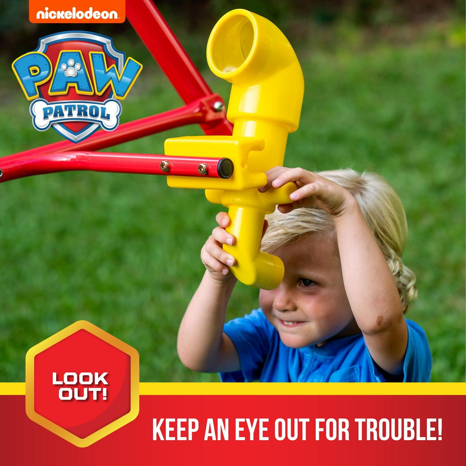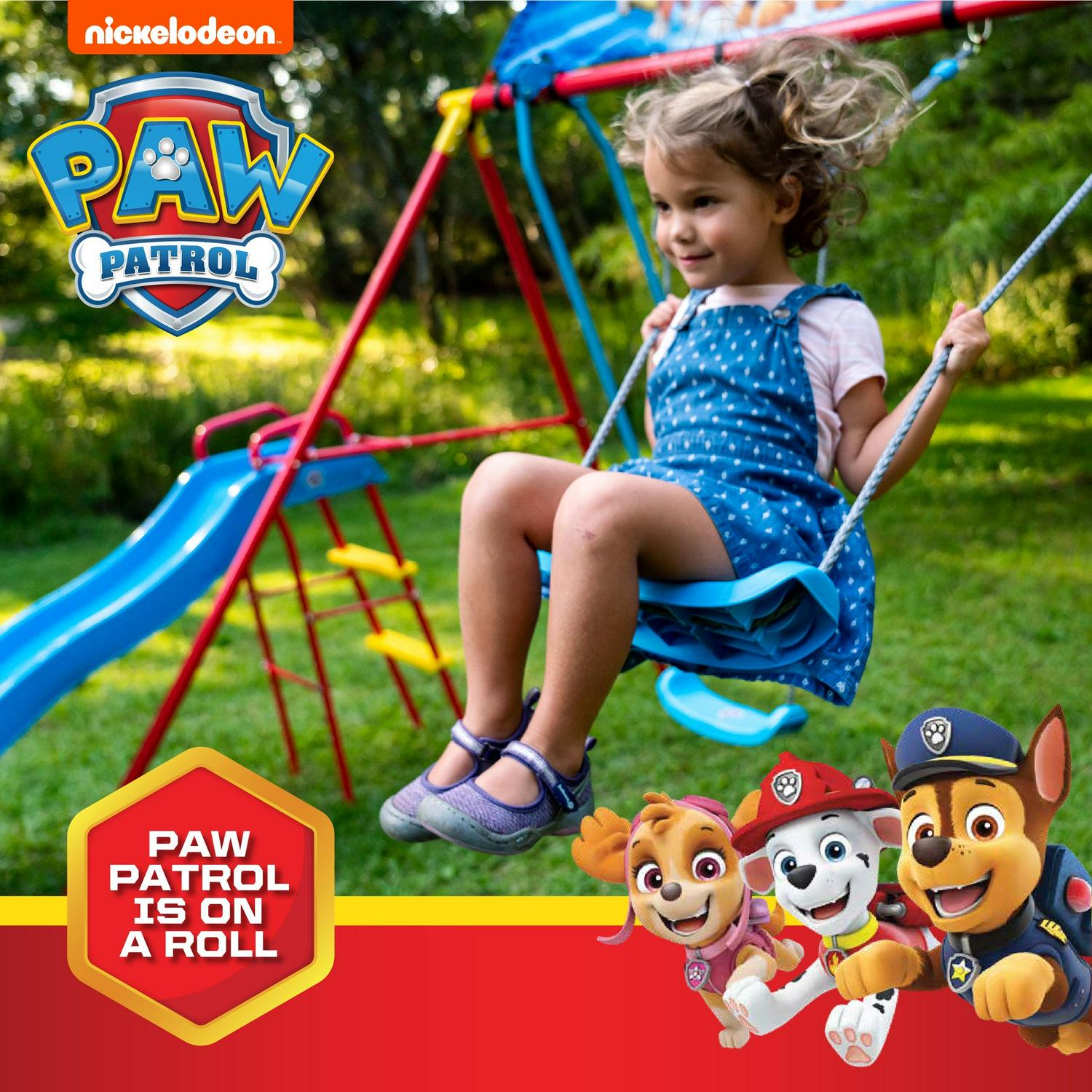 Swurfer Paw Patrol Swingset with Glider, Playground Set for Kids, Ages 4 and up Paw Patrol Swing Set by Swurfer is a great way to spend time with your favorite Paw Patrol characters! Get fired up with Chase, Marshall and the rest of the Paw Patrol crew, while playing with all of your friends at the same time! This action-packed and colorful metal swing set that includes a slide, a glider, periscope, and two different swings. Kids will spend hours of active outdoor play in a number of ways with the Paw Patrol Swing Set!