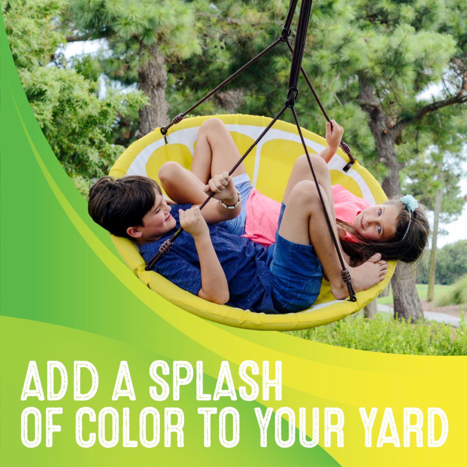 – A BIG SLICE OF HEAVEN with it s gigantic 40 inch diameter, the Slice is big enough for all of your kids to spend all day swinging back and forth under the tree. It s great for taking naps, doing homework, or simply lounging in the shade and enjoying a nice afternoon breeze. The bright colors of the Slice were selected for their ability to provide a splash of color to your perfectly groomed yard