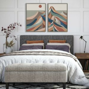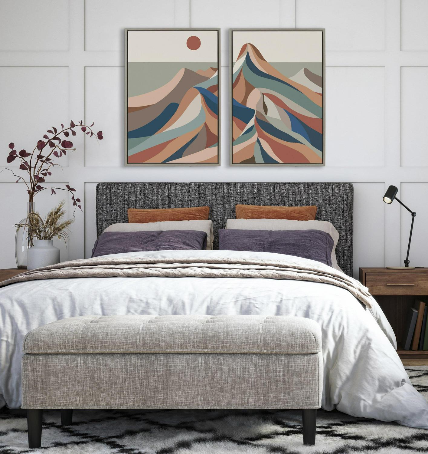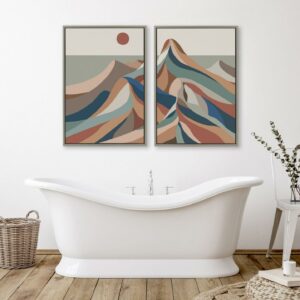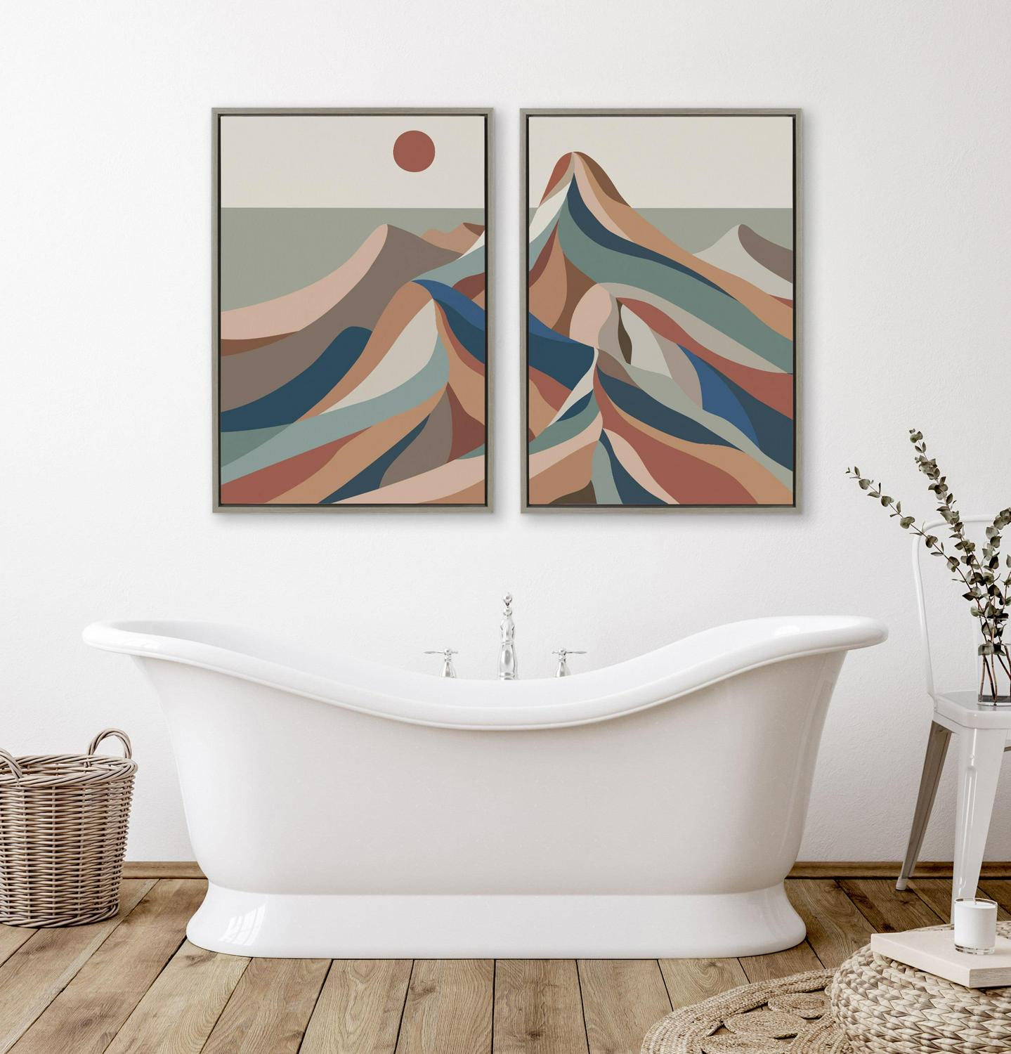 Bring midcentury modern flavor to the common landscape art with this colorful and avant-garde mountain print set! Framed in the USA in Waunakee, Wisconsin, this floating canvas art will be a pleasure to look at every day in your living room, bedroom, office, or any room in the home. This art print also makes an excellent gift for birthdays, holidays, or house-warming parties. Printed on gallery-wrapped canvas and framed with a lightweight polystyrene frame, this wall art has two hangers already attached to the MDF back for easy wall display.