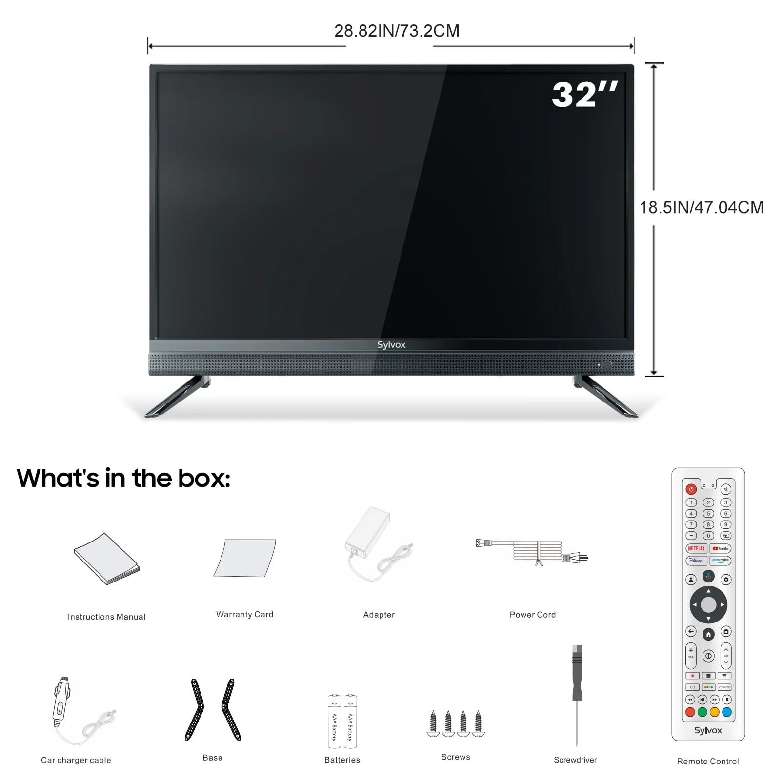 Why Sylvox RV TV? ① 32 inch Smart TV for RV (Vehicle Series) ② Google TV with Google Play, Google Assistant, Chromecast ③ 12 Volt TV, DC 9-32V Wide Voltage Protection, AC 100-240V Power Adapter ④ WiFi, Bluetooth function ⑤ Built-in digital ATSC tuner ⑥ Both for Car and Home use ⑦ Compatible with Vehicle and Home Use ⑧ 1920*1080 FHD TV and 178°H/178°V viewing angle ⑨ Operating Temp 0℃~40℃ (32℉ to 104℉) ⑩ Dimension : 28.8×2.2×7.7 (inch) ⑪ VESA: 200×100mm ⑫ N.W(lb):11 lb ⑬ Meets the standards of the RV world. Passed 4G vibration test. ⑭ Port: RJ45, Optical Out, L/R Audio Out, HDMI X 2, RF, USB X 2, AV IN, Earphone ❤【Smart Google TV】This Smart RV TV operates Google’s advanced system, presenting a intuitive user interface. Easily access your favorite content with Google Assistant through a voice remote. Simply command to find movies, adjust settings, or explore a world of infinite possibilities. ❤【DC/AC Powered】It provides a 9-32V wide voltage protection. The AC power adapter input a range of 100-240V and operates seamlessly on a AC 110V power supply. Successfully passing the 4G vibration test, the plug is not easy to fall in the process of vibration. ❤【1080P RV TV】The crystal-clear screen has a 1080p Full HD resolution delivers vivid picture, while the 178° / 178° viewing angles provide a broader perspective. ❤【HiFi Sound】With built-in dual HiFi speakers, this RV TV delivers immersive audio, Providing excellent visual experience for premium audiovisual tours. ❤【Built-in Google Play Store】Free download a variety of apps, games, and media streaming services through the Google Play Store on this smart TVs, unlocking a world full of endless possibilities. ❤【Built-in Chromecast】With Chromecast, you can cast content directly from your mobile device or PC to your TV screen, bringing your unparalleled entertainment with ease and convenience. ❤【Wide Connectivity】Integrated with ASTC tuner, equipped with USB, HDMI, RF ports. Comes with accessories including a base, cigarette lighter, adapter, and more. ❤【Widely Used 12 Volt TV】Easily using the 12 volt TV in mobile environments such as RVs, motorhome, caravans, camping van, boats, yachts, etc., You can also watch this smart TV at home with an AC 100-240V adapter. ❤【Product Warranty】 ①We take full responsibility for Sylvox TV offers every customer a 30-day return and a one-year warranty to ensure you have a great shopping experience. ②If the TV arrives damaged, please contact us directly. ③If you have any problems with the Sylvox TV during warranty, please feel free to contact us directly. ④It is recommended that you keep the box during the warranty period so that you can apply for after-sales service.