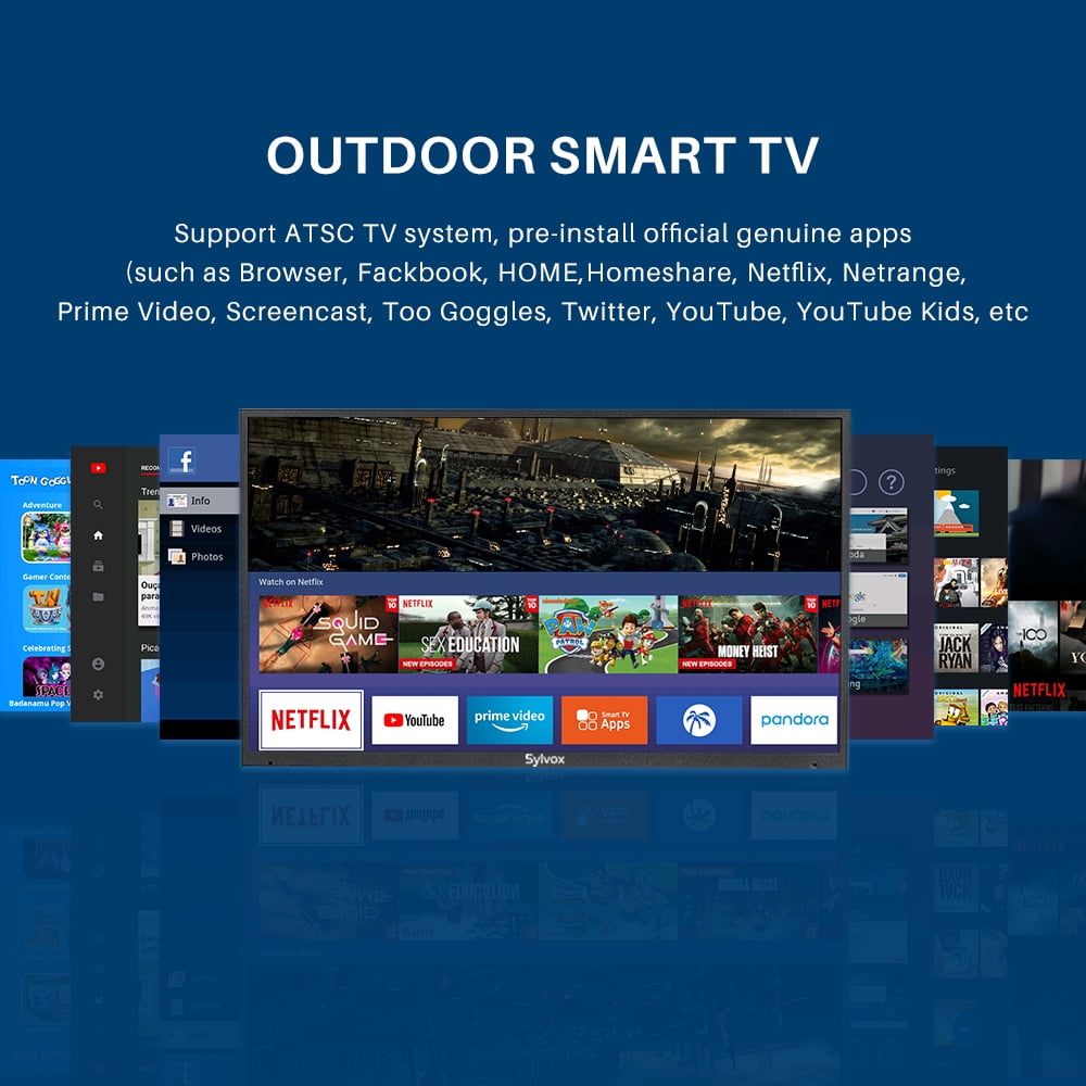 【4K UHD High Resolution】 Sylvox outdoor TV is equipped with 3840*2160 resolution and 1000 nit brightness, which is 4 times brighter than a Indoor TV. Ultra-wide color gamut picture levels and details create amazing picture quality and let you immerse yourself in wonderful visual enjoyment. 【Supports HDR】 10bit, 1.07 billion colors, HDR 10-Bring More Than A Billion Colors. It uses more realistic picture quality, capturing every detail of the picture for you to bring you an immersive picture experience. 【IP55 Waterproof】 Waterproof TV is specially designed for outdoor entertainment. The durable diamond metal shell can be effectively waterproof, windproof, and dustproof, weather resistant from -22F to 122F outside temperatures, pass 72 hours of water testing, it is a real TV outdoor. Suitable for partial sun areas such as patios, porches, swimming pools, and more. 【Smart TV】 Deck Series outdoor smart tv uses Linux system with built-in Netrange app store, pre-install official genuine apps ( Netflix, youtube, Pandora HTML5 Twitter, Facebook, Accu weather, miracast Rx). Downloading other apps is not currently supported. Allows you connect a Firestick or Roku to use Youtube TV App, Xfinity, Hulu… 【Multiple Connections】 Provides multiple connectivity options, including ATSC+NTSC tuner, Optical Out, HDMI×3, USB×2, RJ45, YPbPr ports. It supports seamless connections with various media sources, enrich your entertainment experience. 【Ultra-Narrow Bezel & Unique Cooling】 The appearance of the outdoor TV is simple and elegant, and the ultra-narrow frame effectively increases the display area. The unique heat dissipation technology can accelerate air circulation, you don’t have to worry about any problems even if you use it for a long time in hot weather. 【WiFi&Bluetooth Function】 With WiFi, Bluetooth function, support Android devices screencast Can connect to your outdoor TV via 2.4G WIFI, note: 5G WiFi connection is not supported.