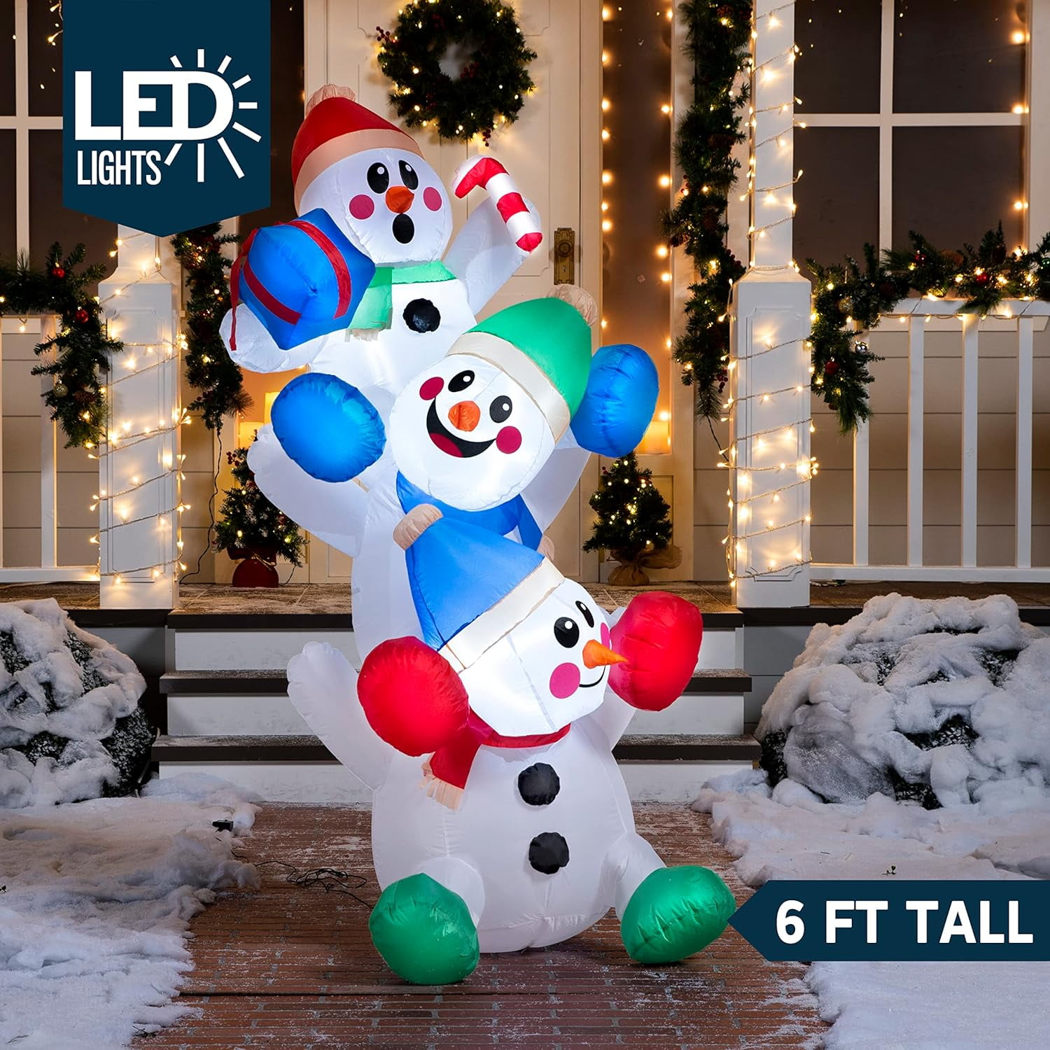 6 FT Christmas Inflatable Stacked Snowman with Build-in LEDs Blow Up Inflatables for Xmas Party, Home Indoor Outdoor Yard Garden Lawn Winter Décor.6 Feet Tall Snowman Inflatable comes with an extended cord, ground stakes, fastened ropes, built-in sandbags, and a plug with UL certification.Perfect for Christmas outdoor yard garden decorations,Christmas event decoration,Holiday blow-ups,Christmas Eve Decor.Christmas night events,cute inflatables,Christmas prop,classroom decorations, Christmas Party decorations and more.