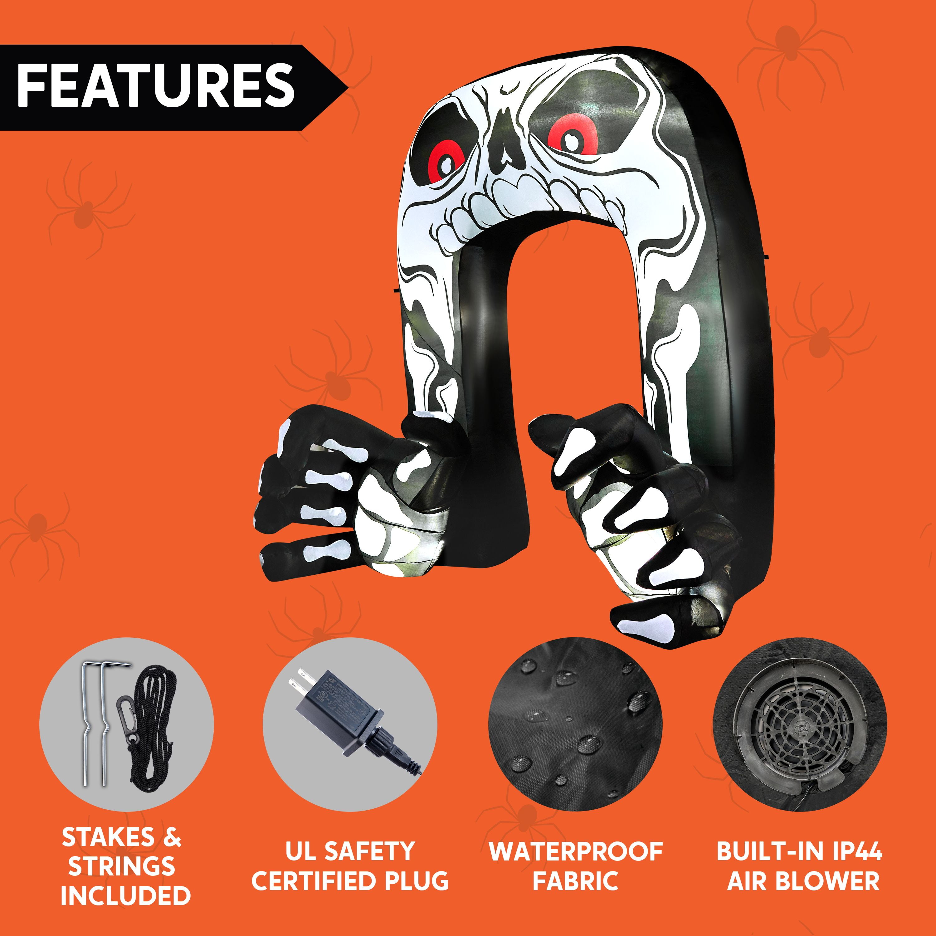 This Halloween inflatable skeleton with hands grabbing decoration has stunning visual effects, making it an unmissable centerpiece for your Halloween party. Product size 8.3 x 4 x 8 feet. Comes with an extended cord, ground stakes, fastened ropes, built-in sandbags, and a plug with UL certification. Our Halloween giant inflatable archway skeleton decoration features built-in LEDs lights that enhance its visual effects with bright lights. The lights intensify its menacing appearance and enhance the overall spooky vibes of your Halloween setup. Our blow up skeleton archway decoration is UL certified, ensuring it meets the highest safety standards. This certification guarantees peace of mind as you enjoy the Halloween season, knowing that the product has undergone rigorous testing for your protection. Setting up and using this Halloween inflatable decoration is hassle-free. It features a user-friendly design that allows for quick inflation and deflation.