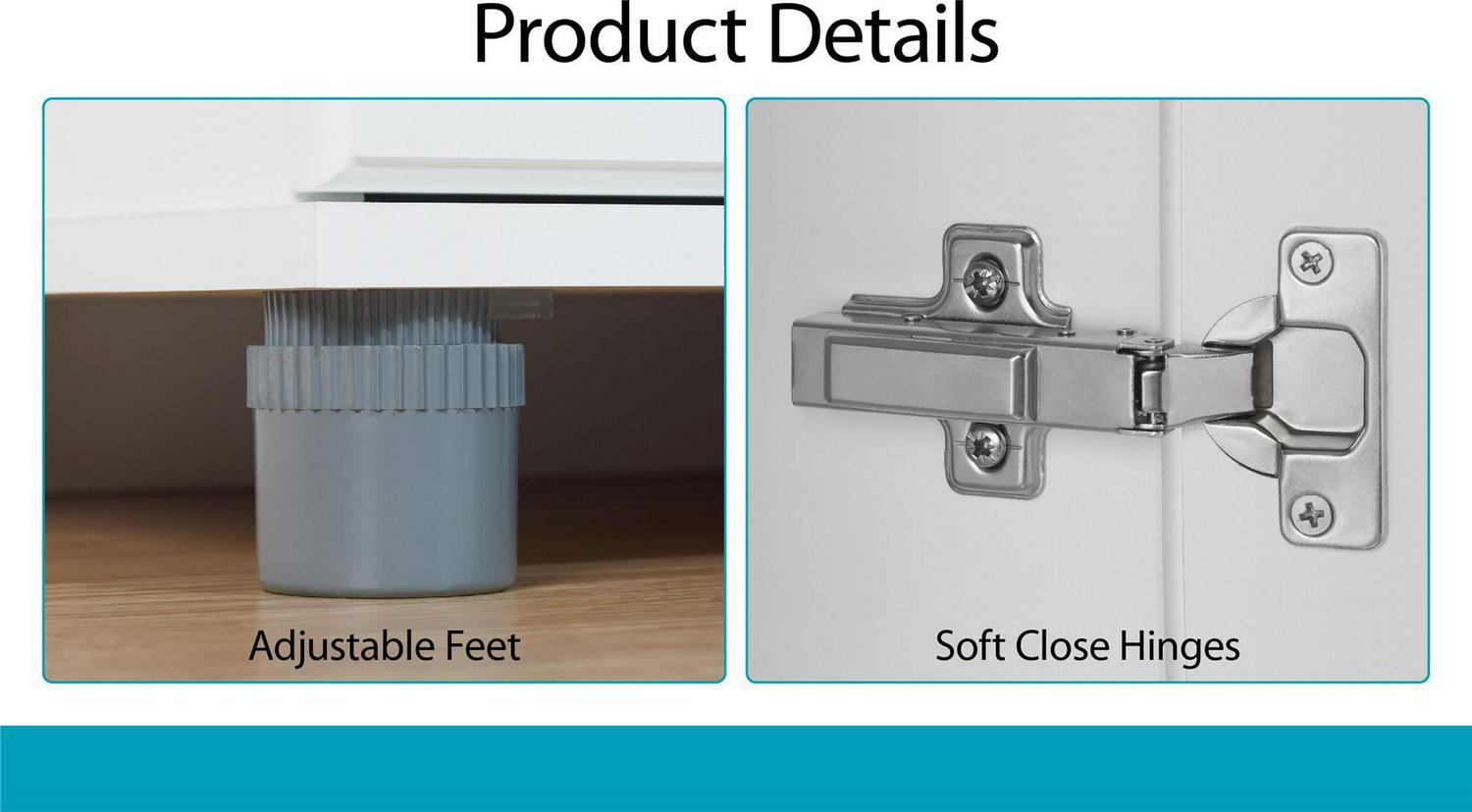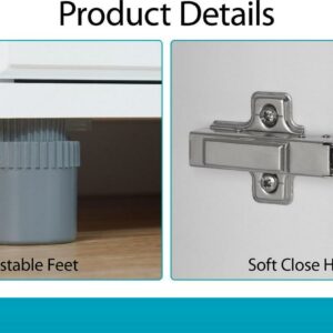 – The 5 shelves, 3 adjustable, can store and organize your cleaning supplies and even kitchen pantry items. Soft closing hinges prevent slamming doors. Adjustable feet keep your Cabinet level on uneven floors