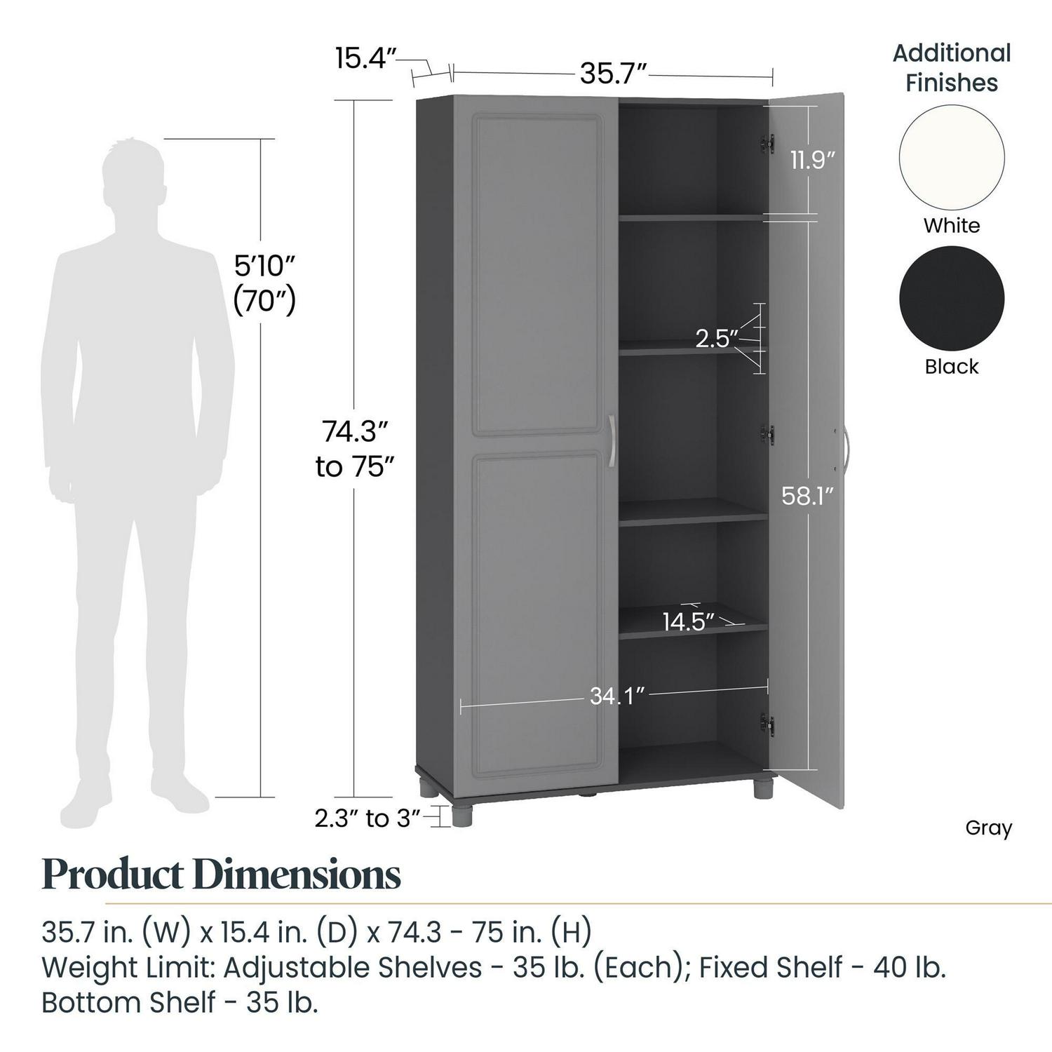 Add extra storage space to any room in your home with the Systembuild Evolution Kendall 36″ Storage Cabinet. Made of laminated MDF and particleboard, the water resistant black finish is easy to clean so the Cabinet can be used anywhere. The interior of this Cabinet features 5 shelves, 3 adjustable, allowing you to customize your storage for both small and large items. Store and organize anything from office supplies to cleaning supplies and even kitchen pantry items. Soft close hinges are adjustable and prevent slamming doors. The adjustable feet make keeping your Cabinet level on uneven floors simple. A wall anchor kit is included to secure the Cabinet to the wall and prevent tipping injuries. Use this piece as a stand-alone item, or combine it with additional Systembuild Evolution Kendall storage items to create the perfect storage solution for your home. The Storage Cabinet ships flat to your door and 2 adults are recommended to assemble. Once assembled, the Cabinet measures to be 74.3125″H x 35.6875″W x 15.375″D.