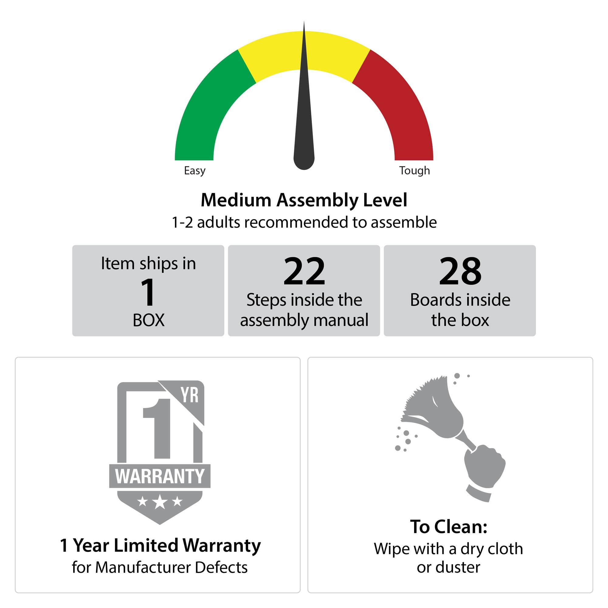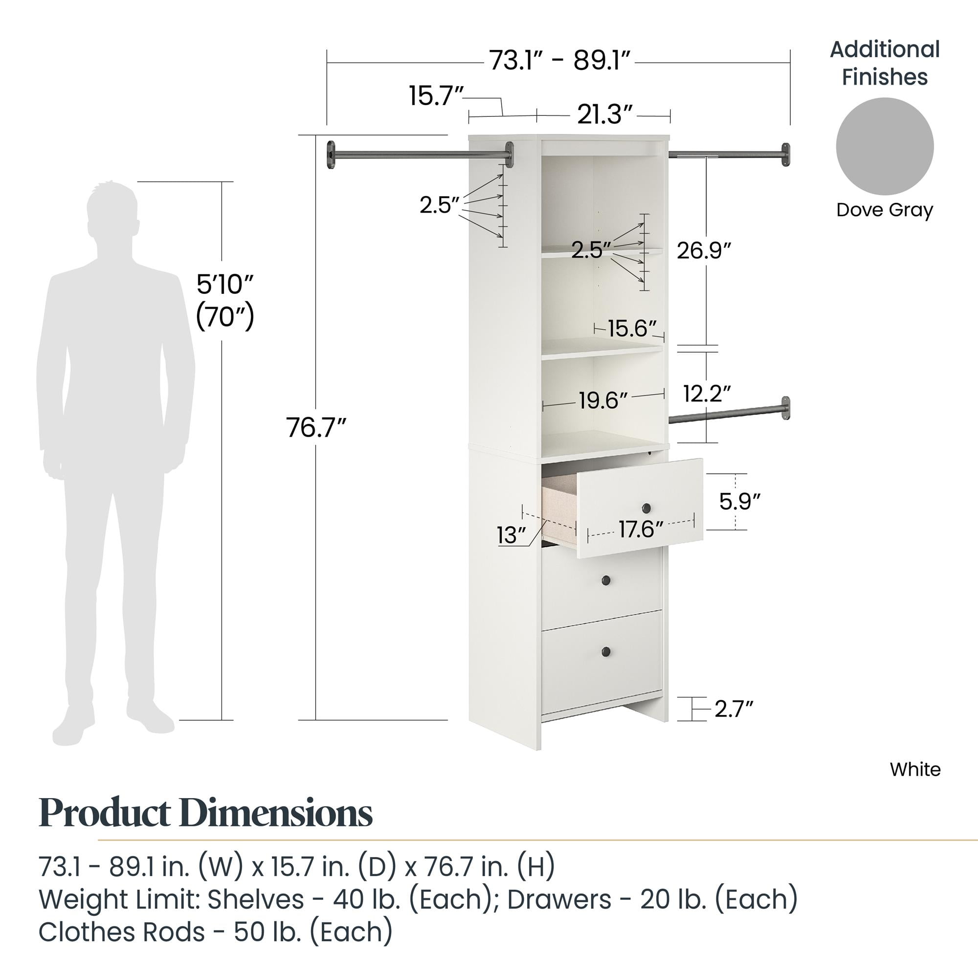 Give yourself the gift of organization in your closet with the Systembuild Evolution Beckett Closet Storage Organizer The simple, yet sleek look of this system brings just enough storage with 3 adjustable clothing rods, 3 shelves, and 3 concealed drawers. Finished in a light gray paper laminate, this sturdy particleboard and metal combination will last for years With clothing rods, shelves, and drawers you can hang your nice blouses, slacks, skirts and sweaters, organize your accessories, jewelry, handbags and shoes all in one place Each Closet Organizer ships flat to your door. Each clothing rod supports a maximum weight of 50 lbs. The 3 center shelves each support a maximum weight of 40 lbs. each, while the drawers hold up to 20 lbs. each. Assembled dimensions: 76.73″H x 73.07-89.1″W x 15.71″D. Two adults are recommended for proper assembly and installation of this Closet Organizer A wall anchor safety bracket is included to provide additional support for this unit 1 Year Limited Warranty Included