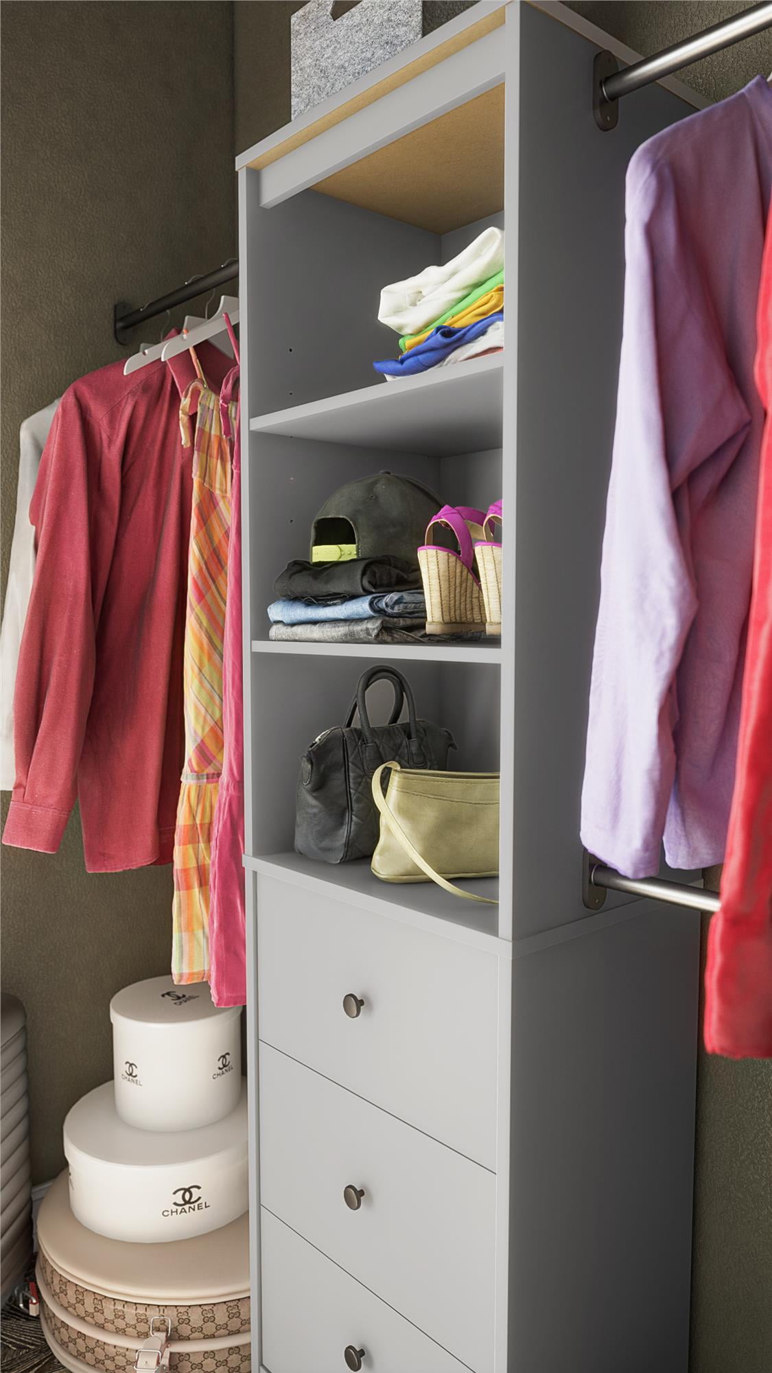 The Systembuild Evolution Beckett Closet Storage Organizer makes it easy to tidy up your messy closet. Don’t just throw your clothing in your drawers or on your closet floor when you have 3 adjustable clothing rods to hang your blouses, sweaters, slacks or skirts. The clothing rods modify to fit your reach-in closet from 28″ – 36″ wide and secure your storage system with a tight fit. Each side panel has predrilled holes so you can move your clothing rods up or down to fit your needs. The center tower has 3 open shelves to display your sweaters, handbags, hats, jewelry and more and the lower half of the tower is designed with 3 drawers for additional accessory or clothing storage. Finished in a laminated light gray, this particleboard and metal tube construction measures to be 76.73″H x 73.07-89.1″W x 15.71″D. Adding to the security of this storage system is the provided wall anchor kit that stabilizes the tower and assures the customer that their items will stay exactly where they need to be. Two adults are recommended for the proper assembly and installation of this Closet Organizer.